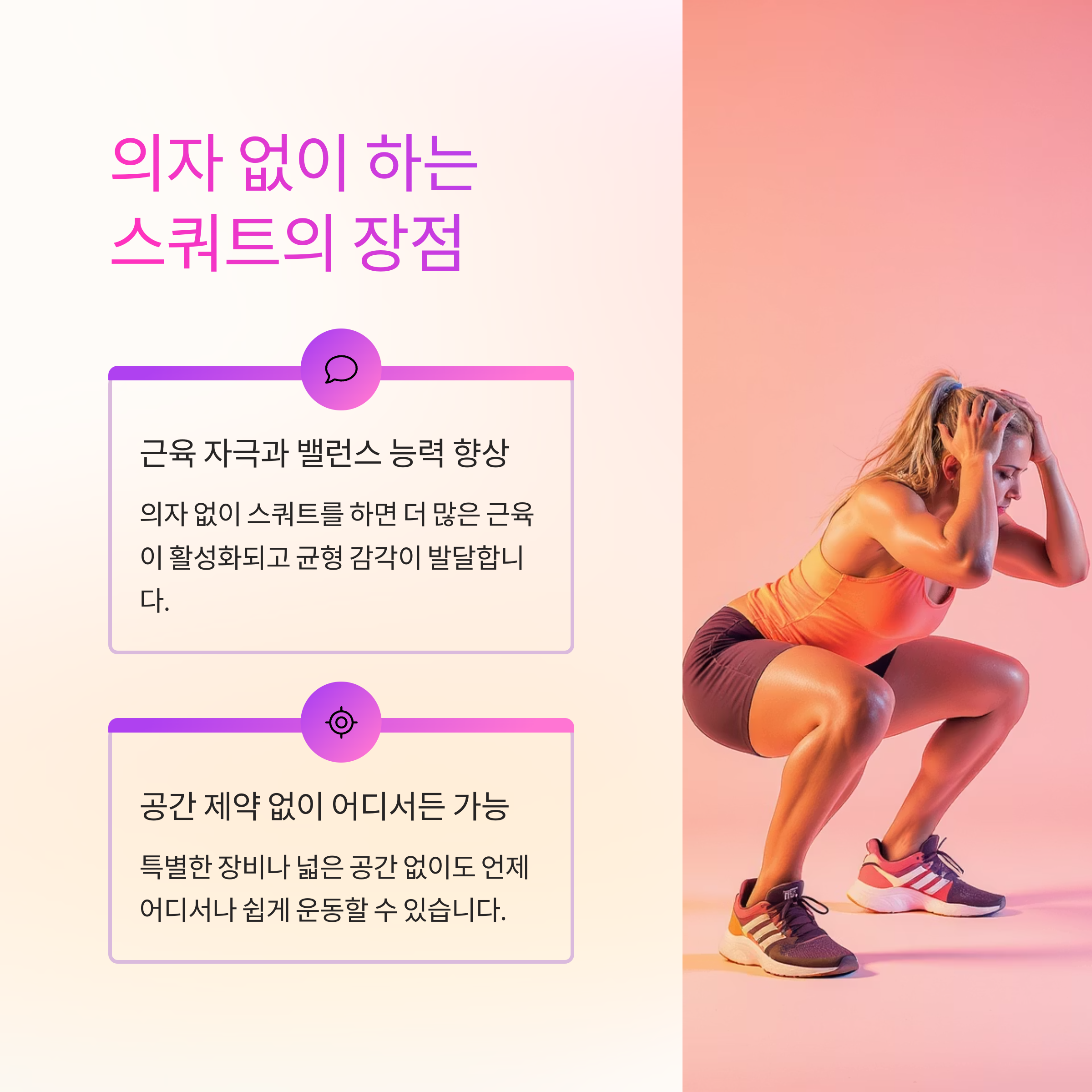 의자 없이 하는 스쿼트는 중심 잡기, 근육 자극, 자세 인지 측면에서 큰 이점을 가집니다. 특히 엉덩이 근육(대둔근)과 허벅지 앞쪽(대퇴사두근)의 자극이 훨씬 명확하게 느껴지며, 코어를 이용한 밸런스 유지 능력도 향상됩니다. 또 하체의 관절 가동 범위도 자연스럽게 넓어져 유연성 개선에도 도움을 줍니다. 무엇보다 도구에 의존하지 않고 내 몸만으로 운동한다는 점에서, 운동의 본질에 가까워지며 공간 제약 없이 언제 어디서든 실행할 수 있다는 것도 큰 장점입니다.