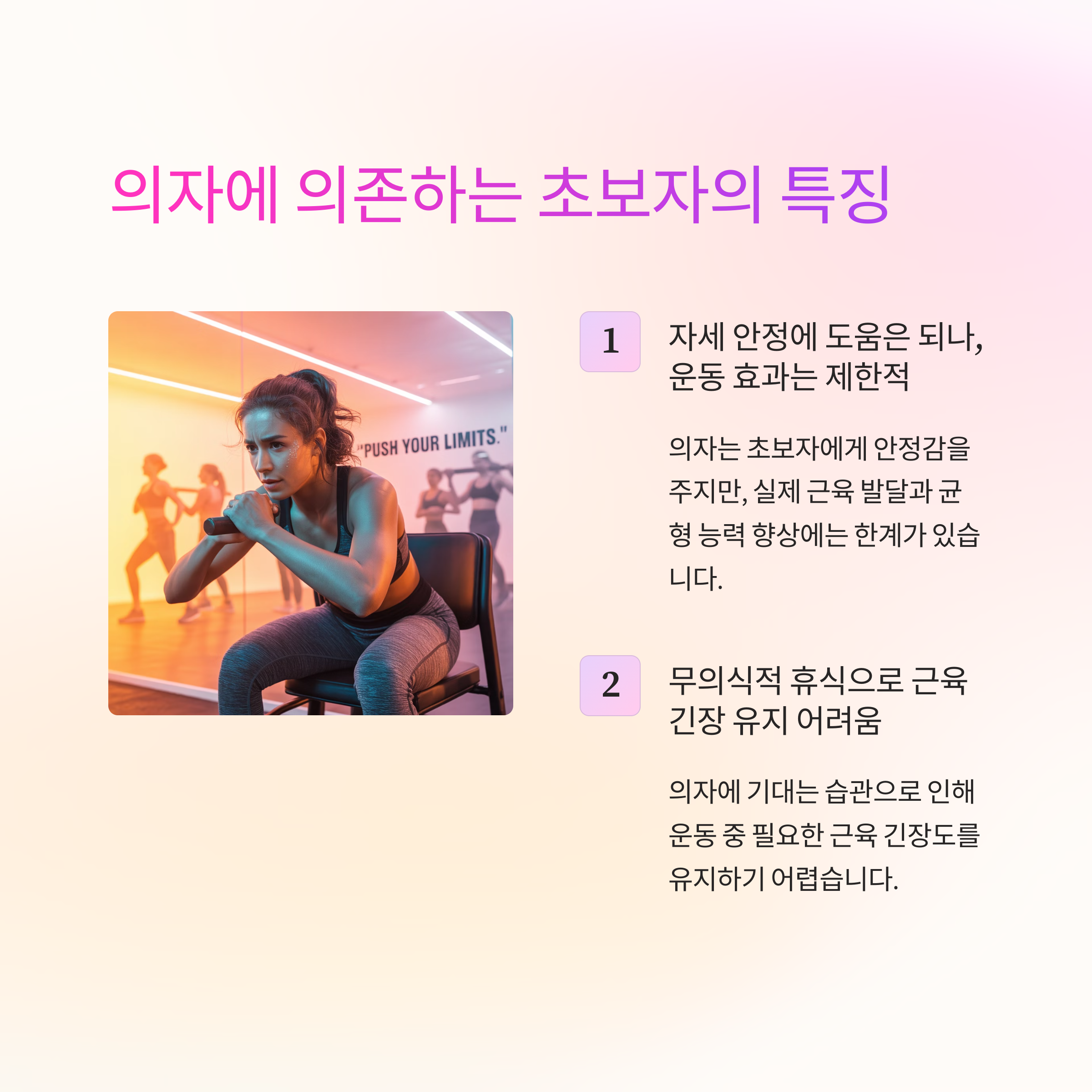 스쿼트를 막 시작하는 사람들은 균형 잡기가 어렵고, 무릎 통증이나 허리 부담을 우려해 의자를 이용한 '시트 스쿼트'로 연습하는 경우가 많습니다. 이 방식은 자세를 배우고 중심을 잡는 데는 도움이 되지만, 일정 수준 이상의 근력과 움직임을 발전시키기엔 한계가 있습니다. 또한 의자에 닿는 순간 무의식적으로 휴식을 취하게 되어, 하체 근육에 지속적인 긴장을 유지하기 어렵습니다. 따라서 어느 정도 자세 감각이 잡히고 나면, 의자에 의존하지 않고 스스로 균형을 잡는 연습으로 넘어가는 것이 중요합니다.