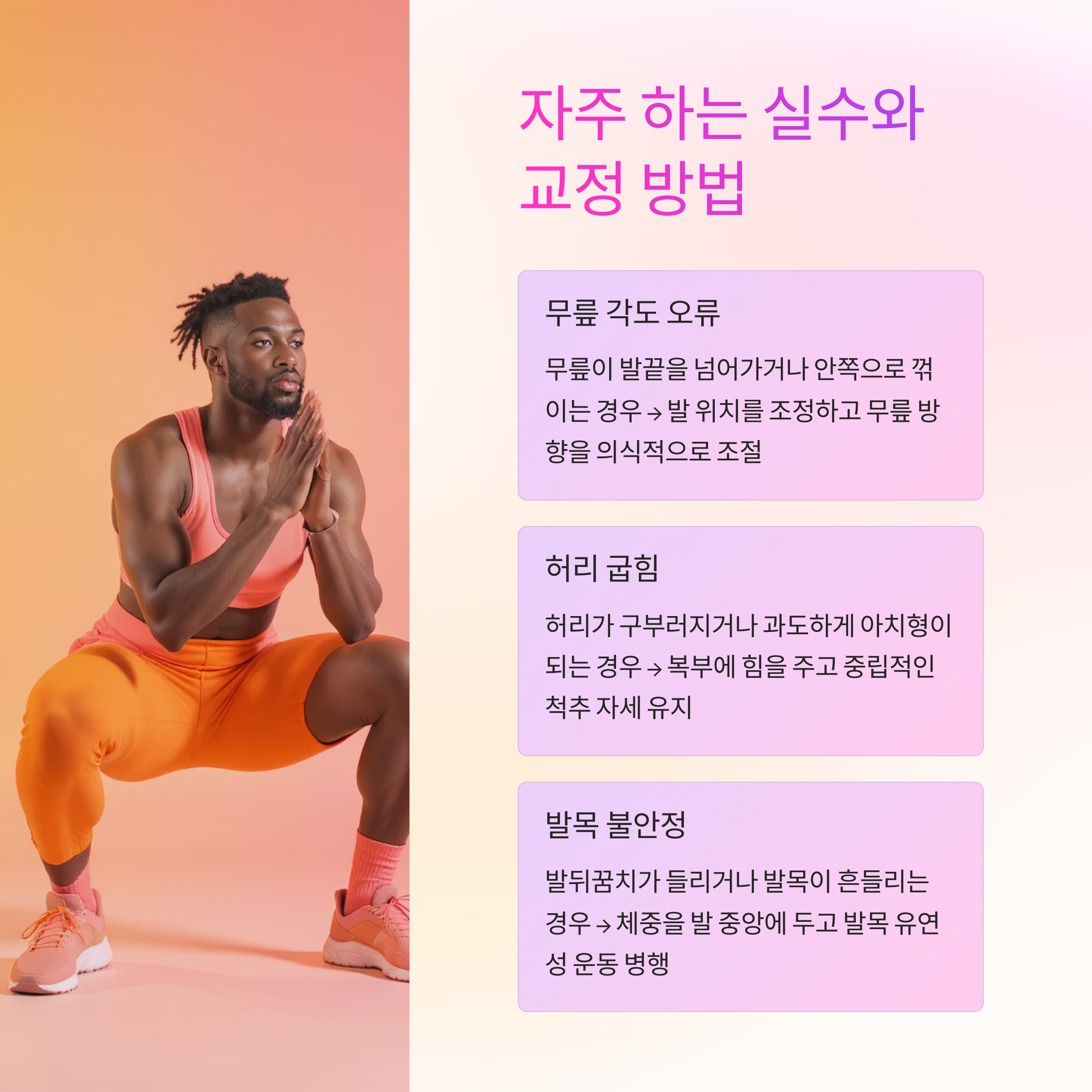 무릎이 안쪽으로 모임: 고관절을 열어주는 동작을 사전에 실시하고, 무릎이 바깥을 향하도록 의식하세요.