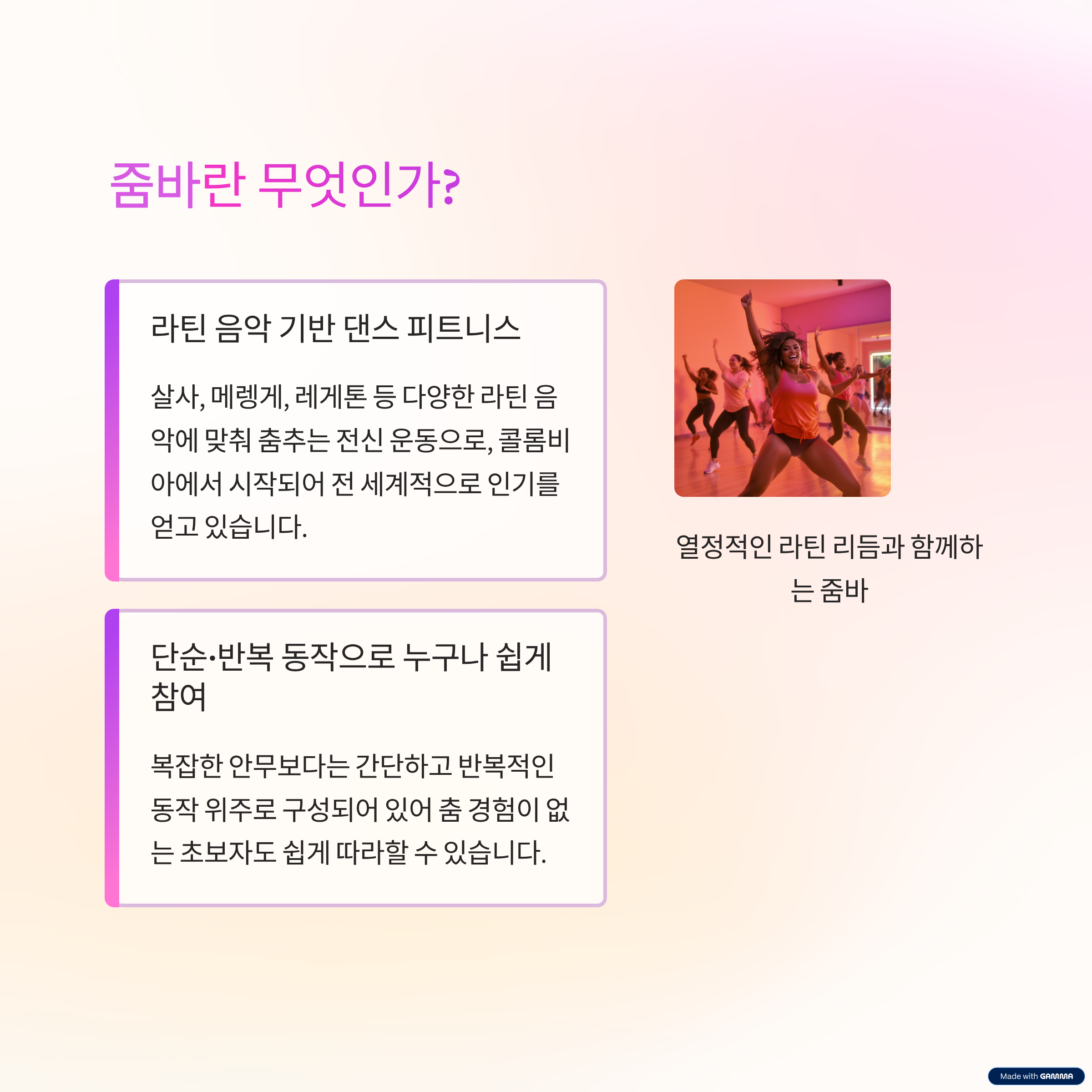 줌바는 1990년대 콜롬비아에서 시작된 댄스 피트니스 프로그램으로, 라틴 음악을 기반으로 한 경쾌한 동작이 특징입니다. 살사, 메렝게, 레게톤, 삼바 등 다양한 라틴 댄스 요소가 결합되어 있어 전신 유산소 효과와 함께 엉덩이, 허벅지, 복부 같은 하체와 코어 강화에도 효과적입니다. 또한 동작이 단순하고 반복적이어서 춤을 잘 못 춰도 누구나 쉽게 따라 할 수 있습니다.