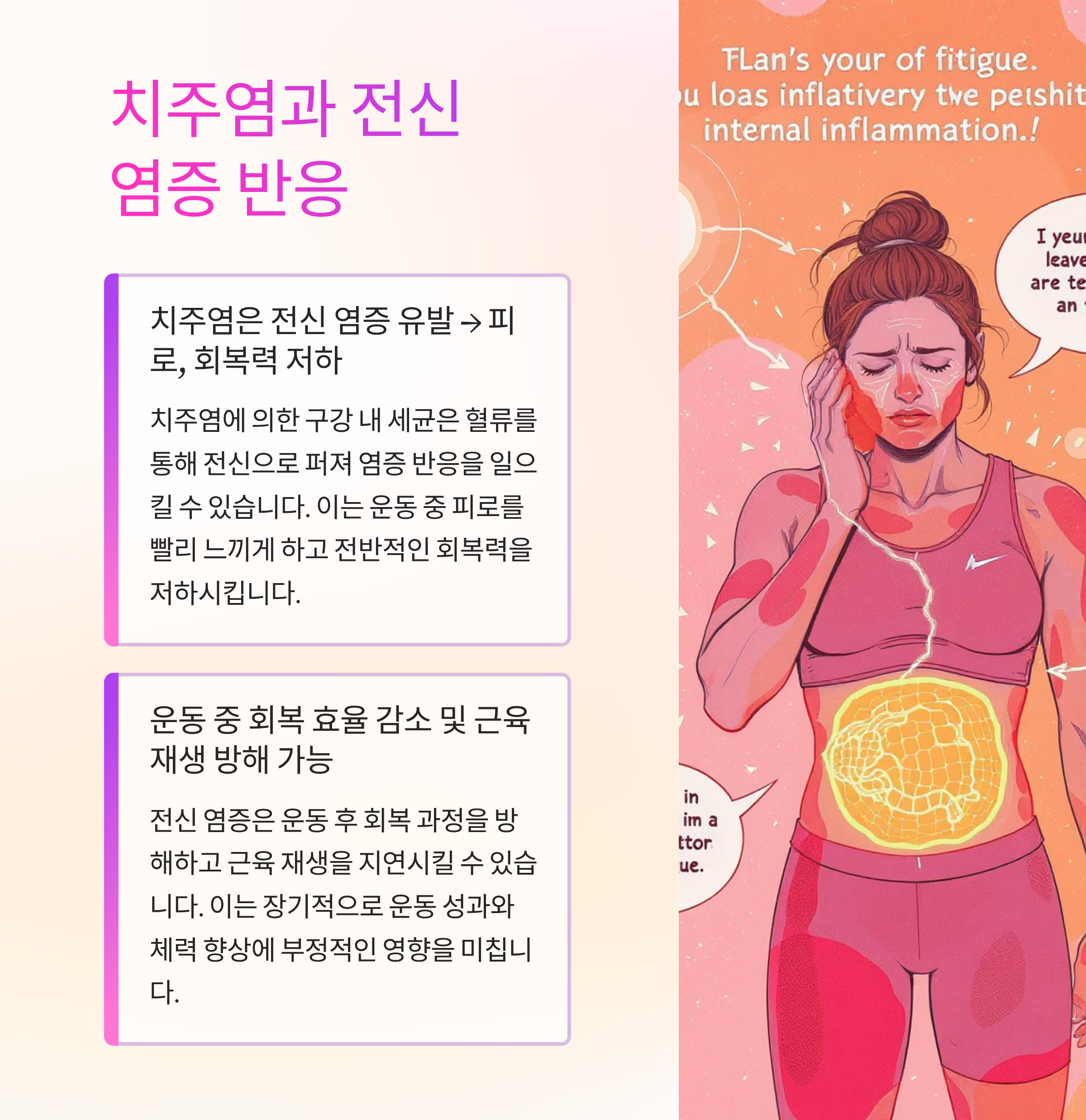구강 내 만성 염증인 치주염은 입안에만 국한되지 않고, 전신 염증 반응을 유발할 수 있습니다. 염증성 물질이 혈관을 통해 전신으로 퍼지며, 회복력 저하와 피로감, 면역력 저하 등의 원인이 될 수 있습니다. 특히 운동 직후의 회복 과정에서는 체내 염증 수준이 낮을수록 효율적인 근육 재생이 이뤄지기 때문에, 구강 염증은 운동 효율을 떨어뜨리는 간접적 요인이 됩니다. 입속 작은 염증이 운동 성능에 그림자처럼 영향을 미칠 수 있다는 사실은 의외로 널리 알려지지 않았습니다.