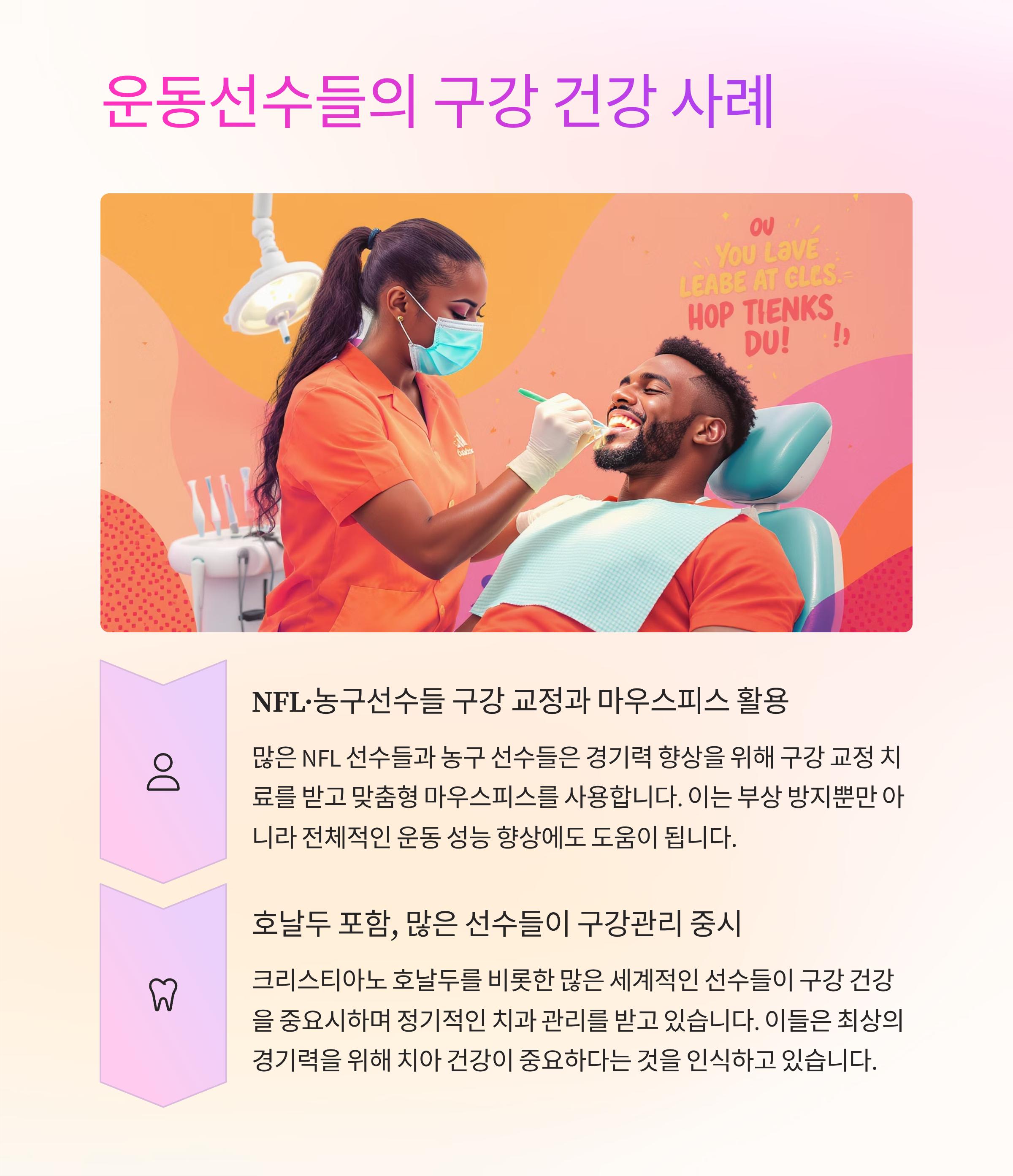 → 실제로 많은 프로선수들이 구강 문제로 경기력 저하를 경험한 적이 있습니다.