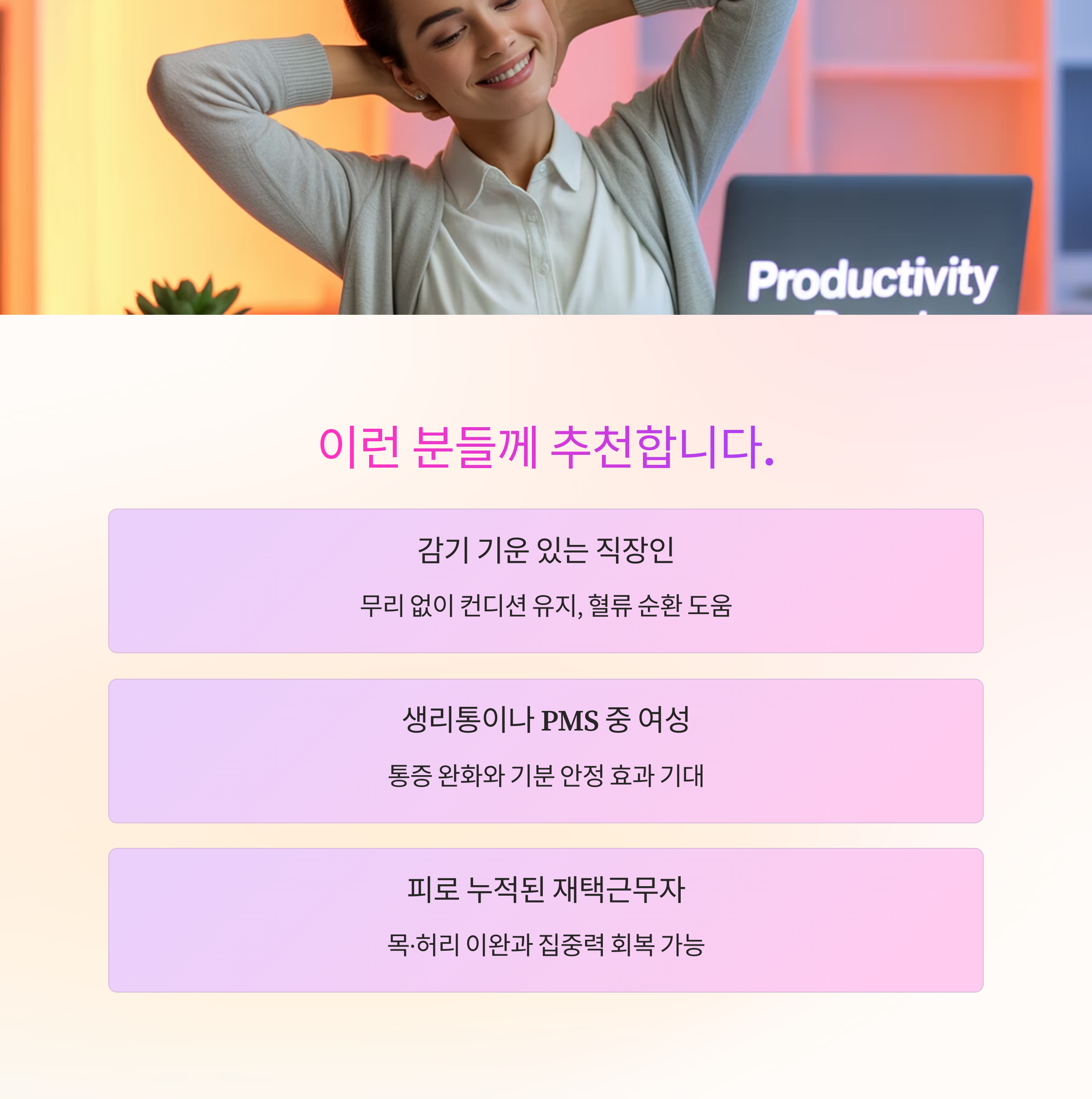 | 피로 누적된 재택근무자 | 목·허리 이완과 집중력 회복 가능 |