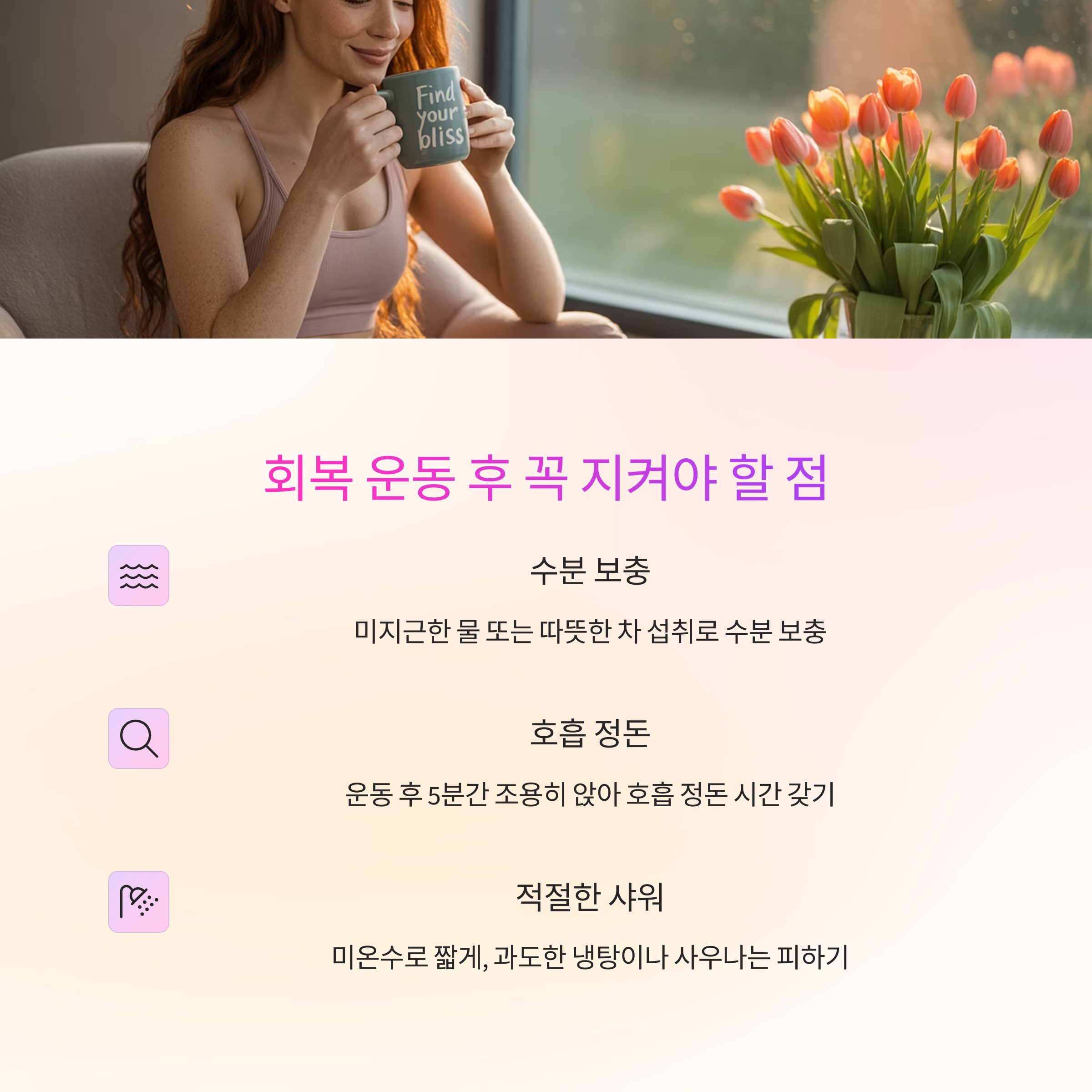 - 운동 후 5분간 조용히 앉아 호흡 정돈 시간 갖기