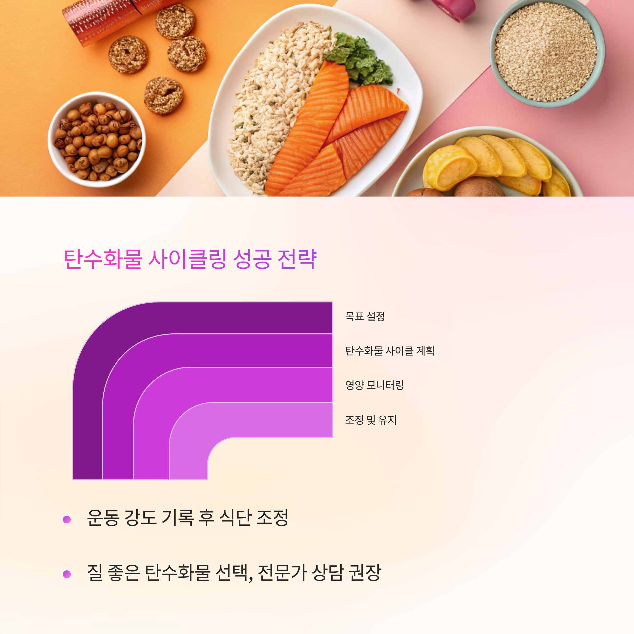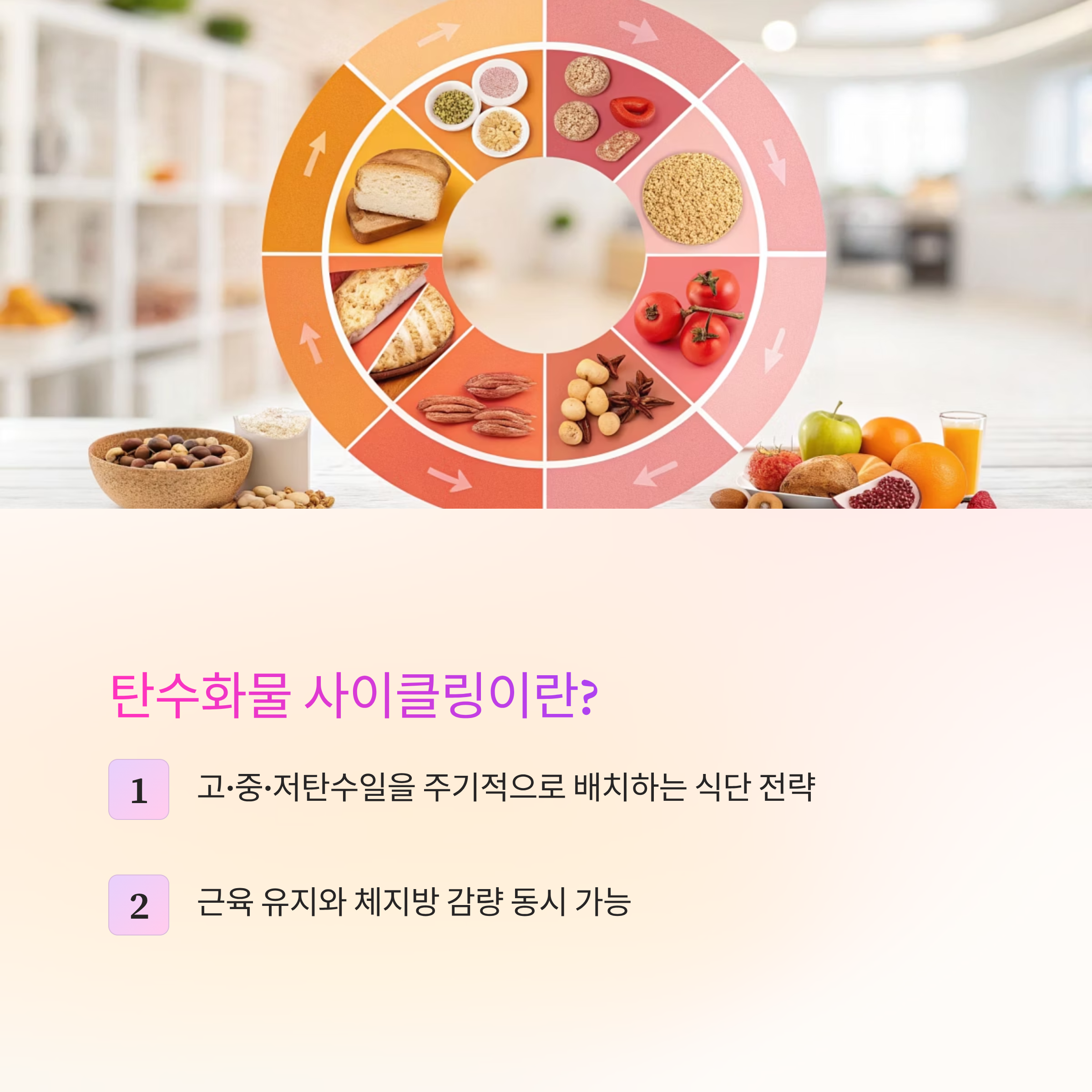 탄수화물 사이클링은 운동 강도에 맞춰 탄수화물 섭취를 조절해 체지방을 줄이고 근육을 유지하는 전략입니다. 고탄수·중탄수·저탄수일을 적절히 배치하면 운동 성과와 다이어트 효과를 동시에 얻을 수 있습니다. 단, 무리하지 않고 꾸준히 실천하는 것이 핵심입니다.