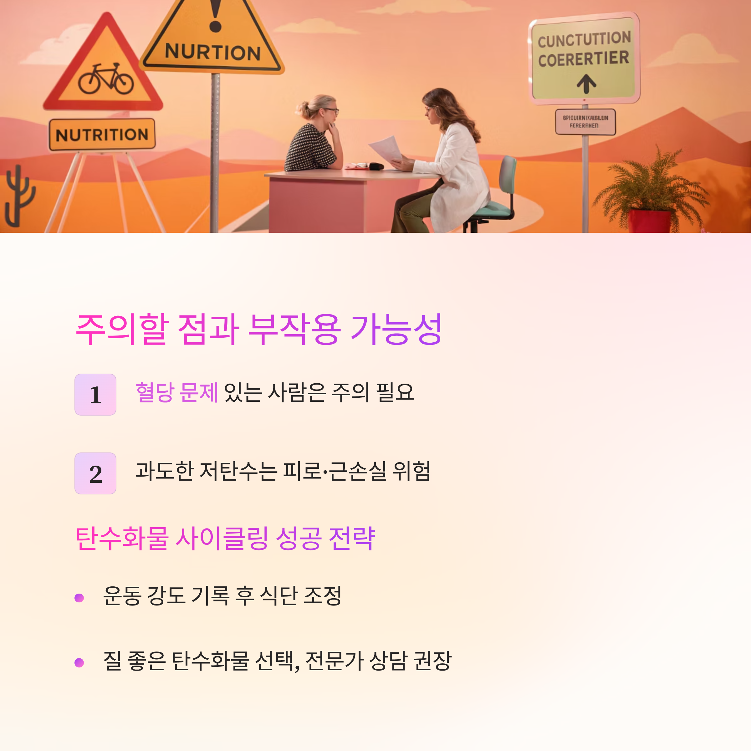 탄수화물 사이클링은 효과적이지만 모든 사람에게 맞는 것은 아닙니다. 당뇨병 환자나 혈당 조절에 문제가 있는 사람은 전문가 상담이 필요합니다. 또한 저탄수일이 과도하면 피로, 집중력 저하, 근손실 위험이 있을 수 있습니다. 따라서 자신의 체력과 목표에 맞게 조절해야 합니다.