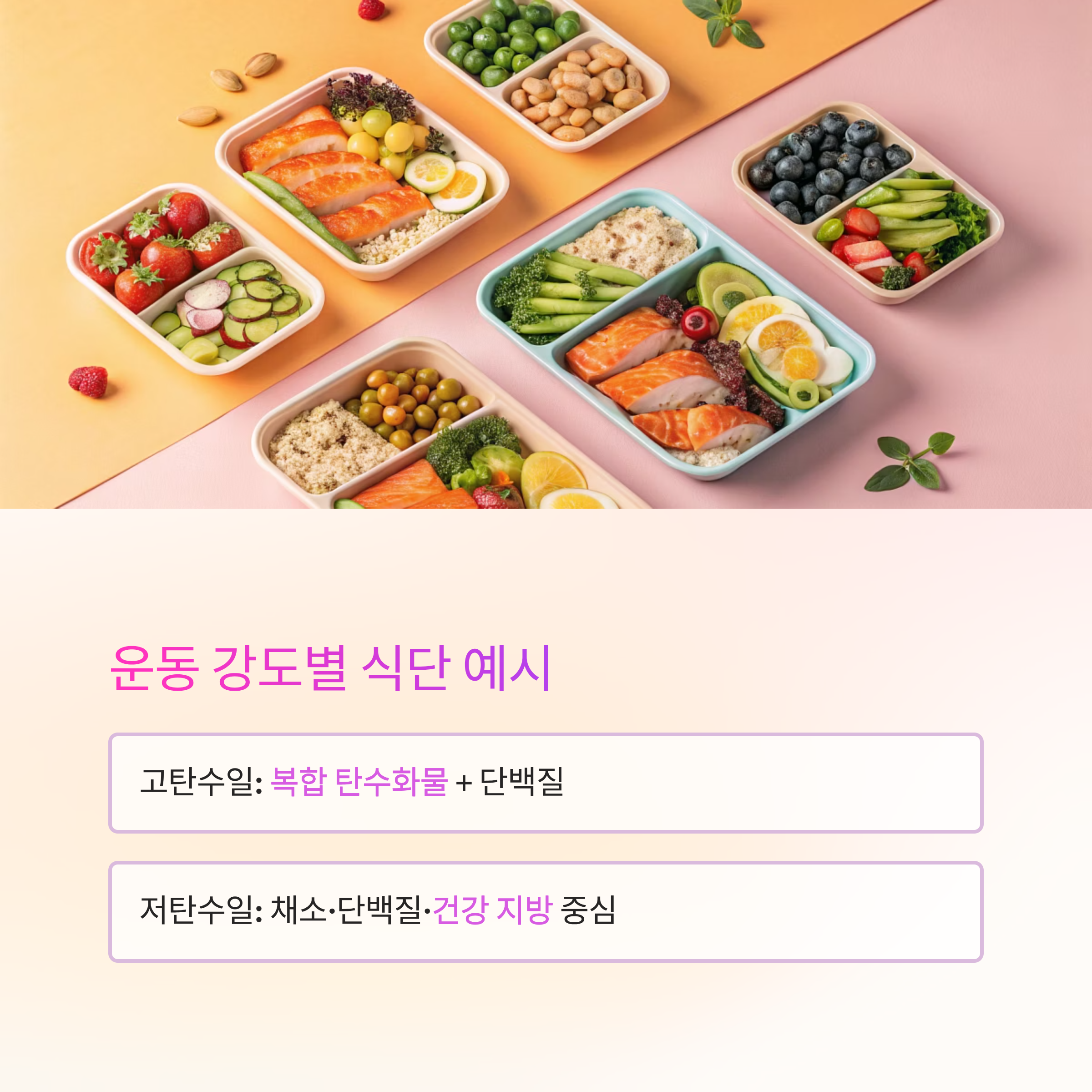 - 고탄수일: 현미밥, 고구마, 과일 등 복합 탄수화물 위주 + 단백질(닭가슴살, 두부)
