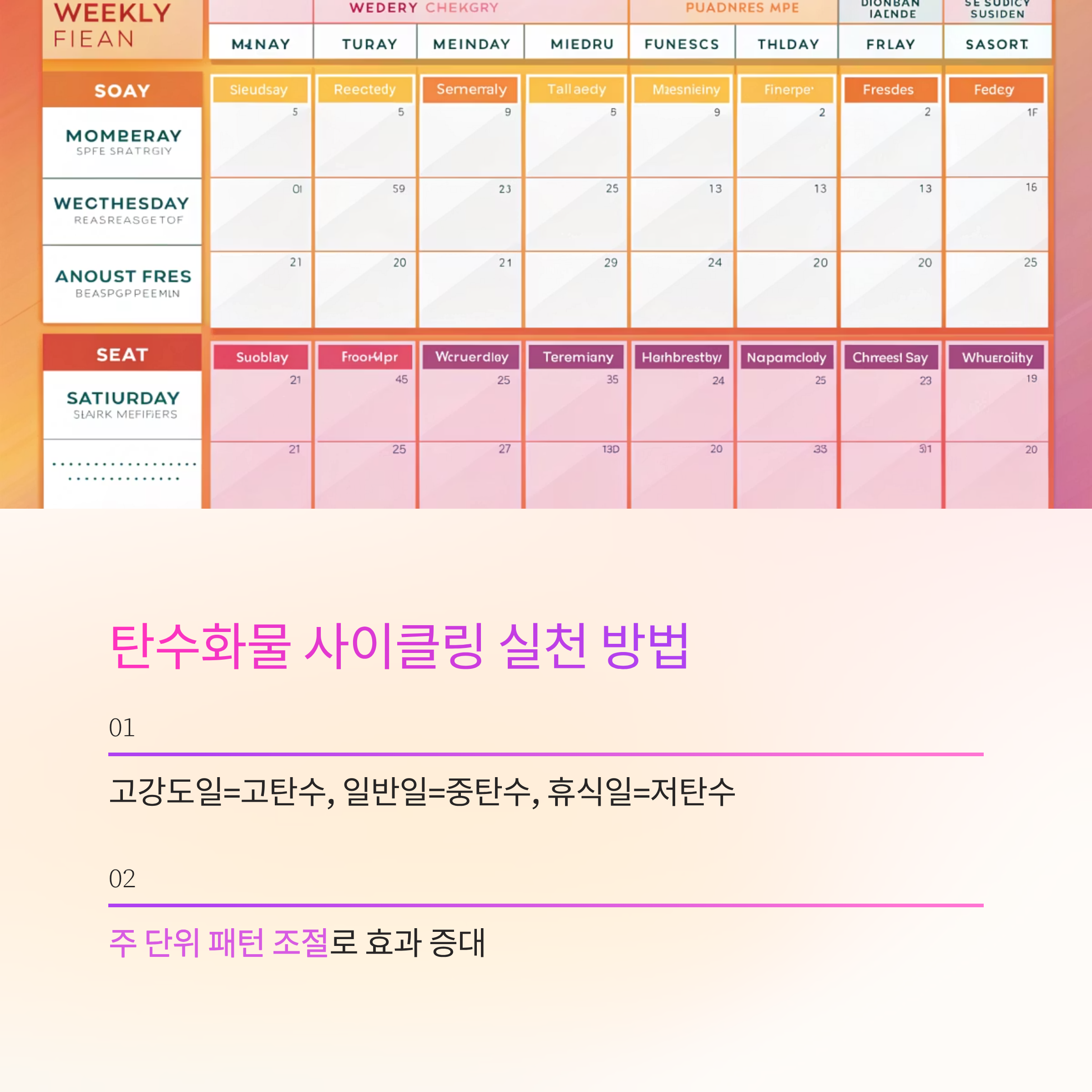 3. 휴식일 → 저탄수일 이러한 패턴을 주 단위로 배치하면 에너지 활용과 체지방 감량 모두에 유리합니다.