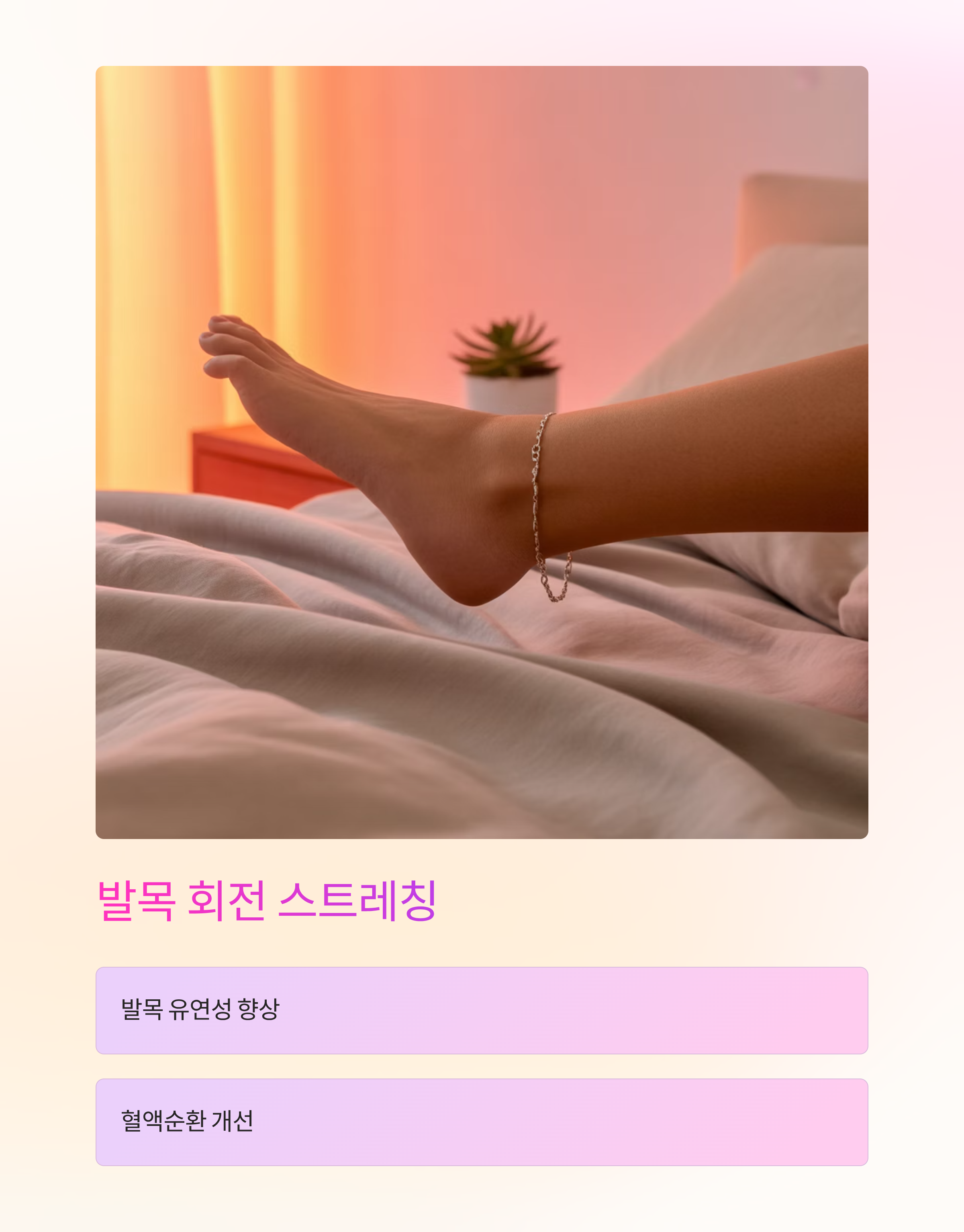 누운 상태에서 한쪽 발을 들어 시계 방향 5회, 반대 방향 5회 돌립니다. 발목 유연성을 높여 아침 첫 발걸음이 가벼워집니다. 혈액순환 개선에도 도움이 됩니다.