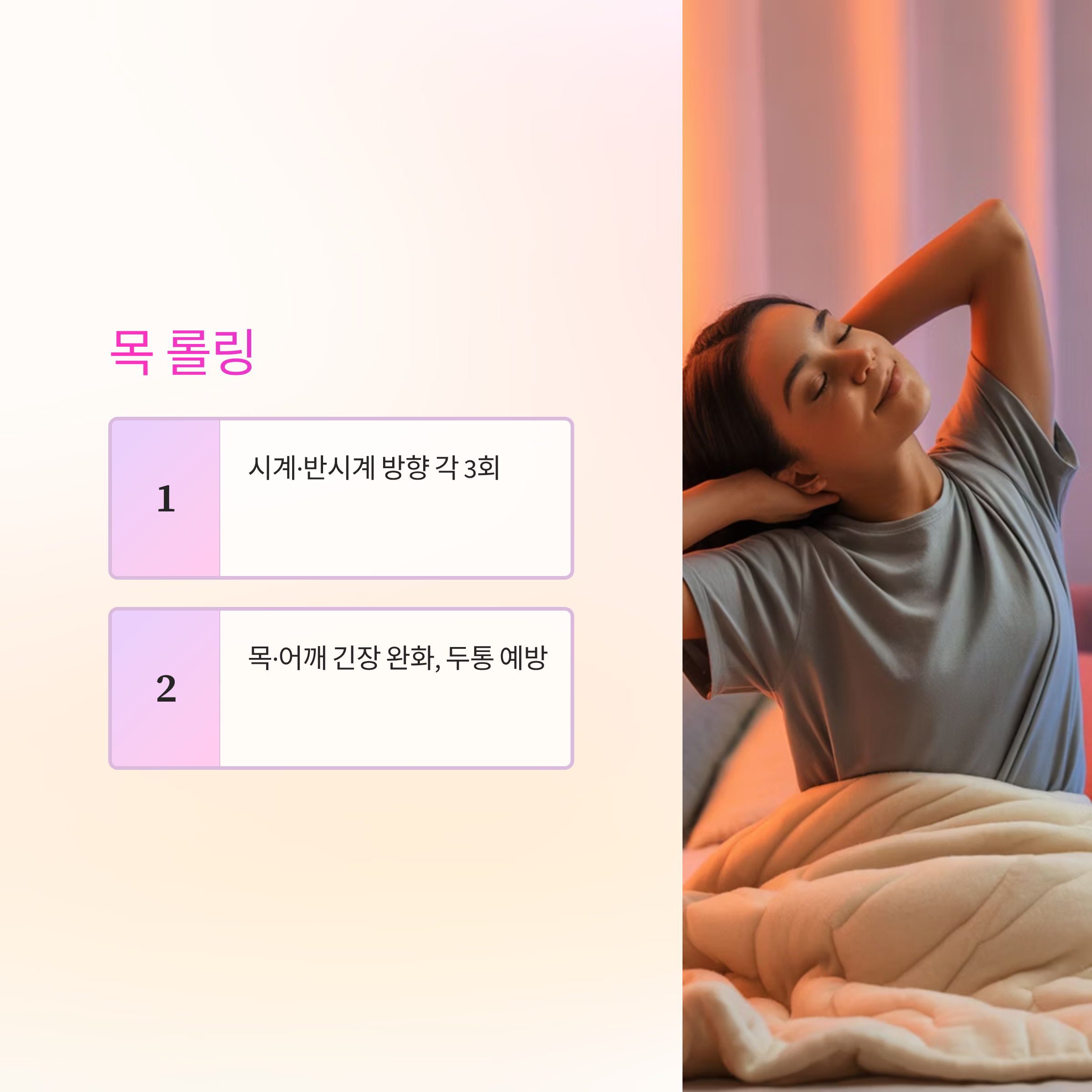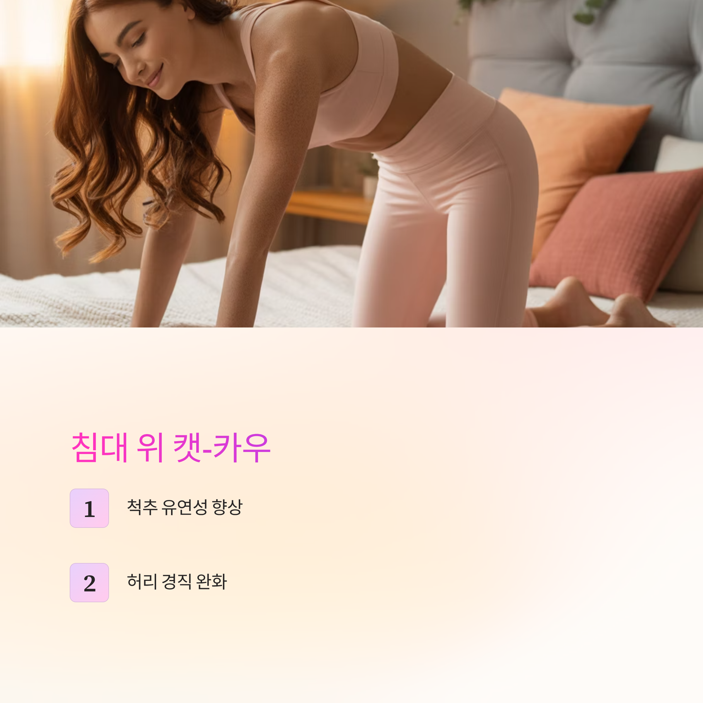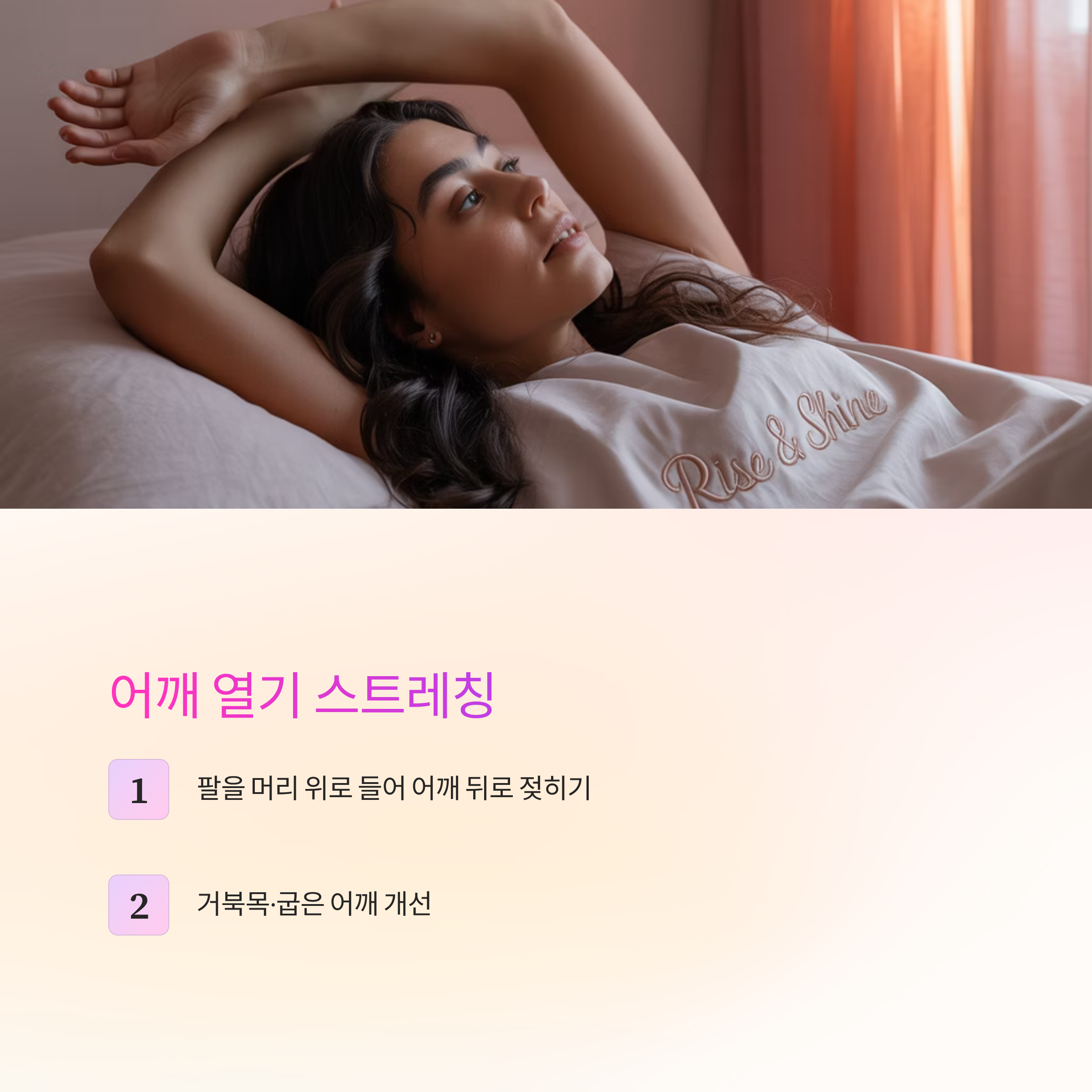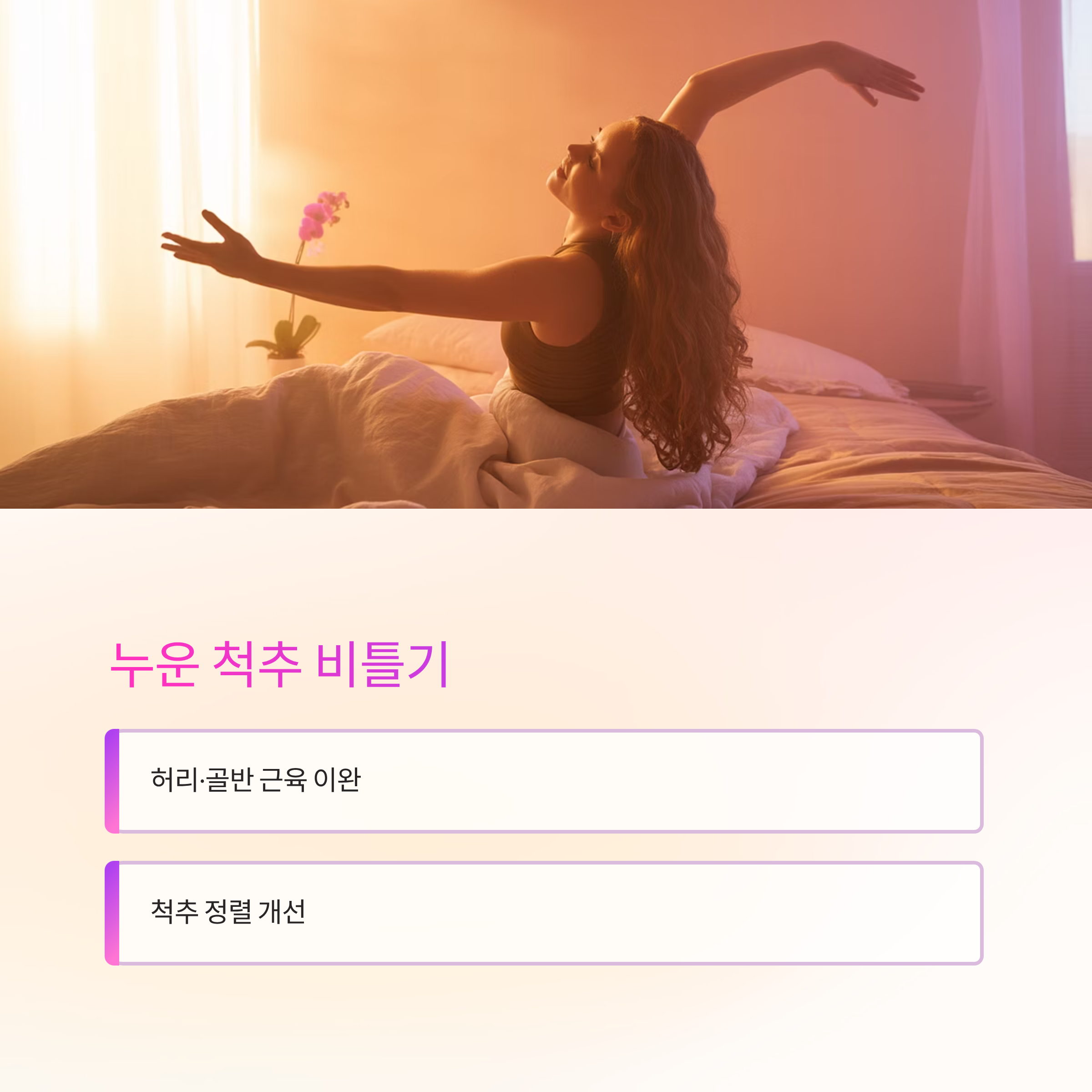 침대에서 하는 아침 스트레칭은 하루의 시작을 부드럽고 활기차게 만들어줍니다. 목·어깨·척추·하체를 고르게 풀어주어 몸과 마음 모두를 깨어나게 합니다.
