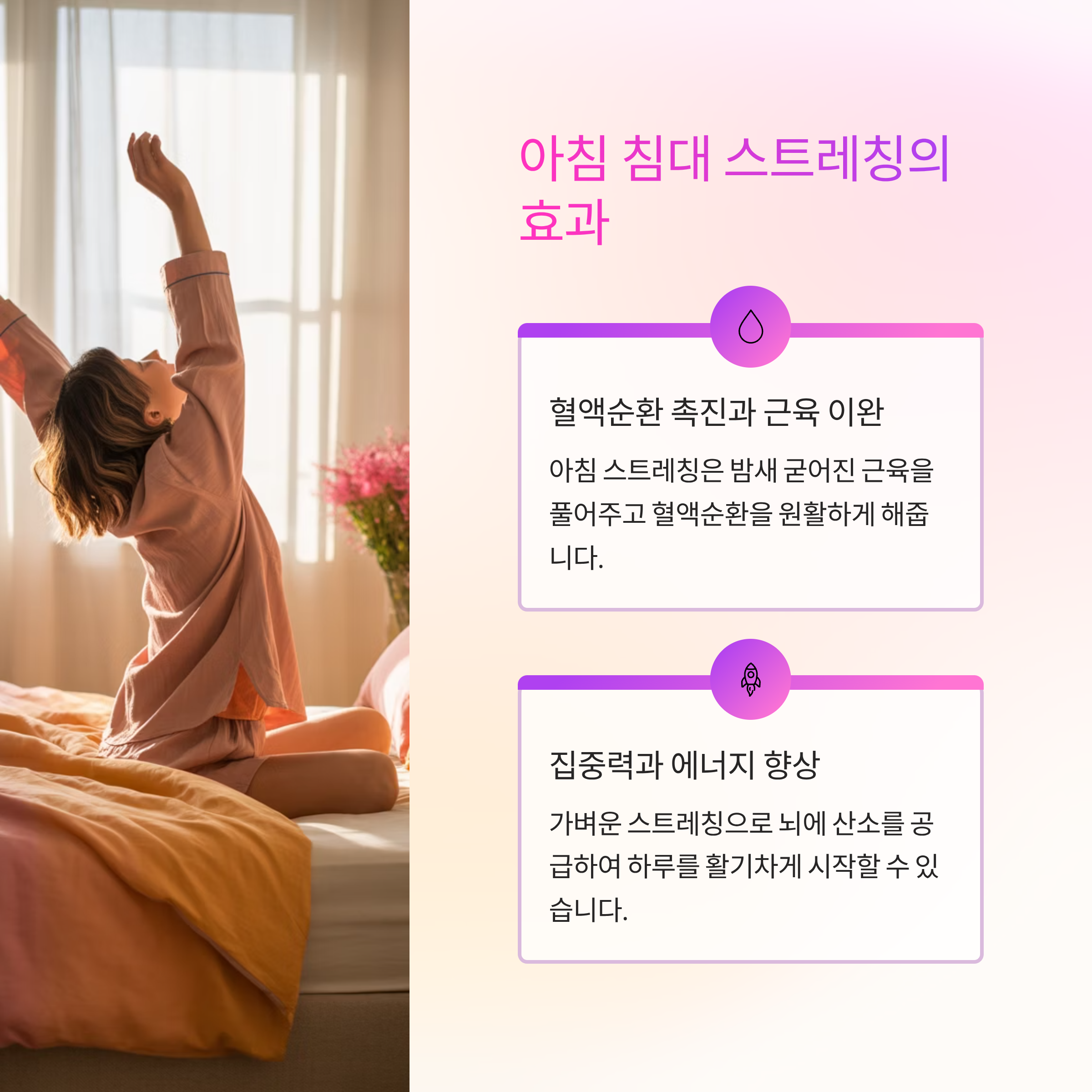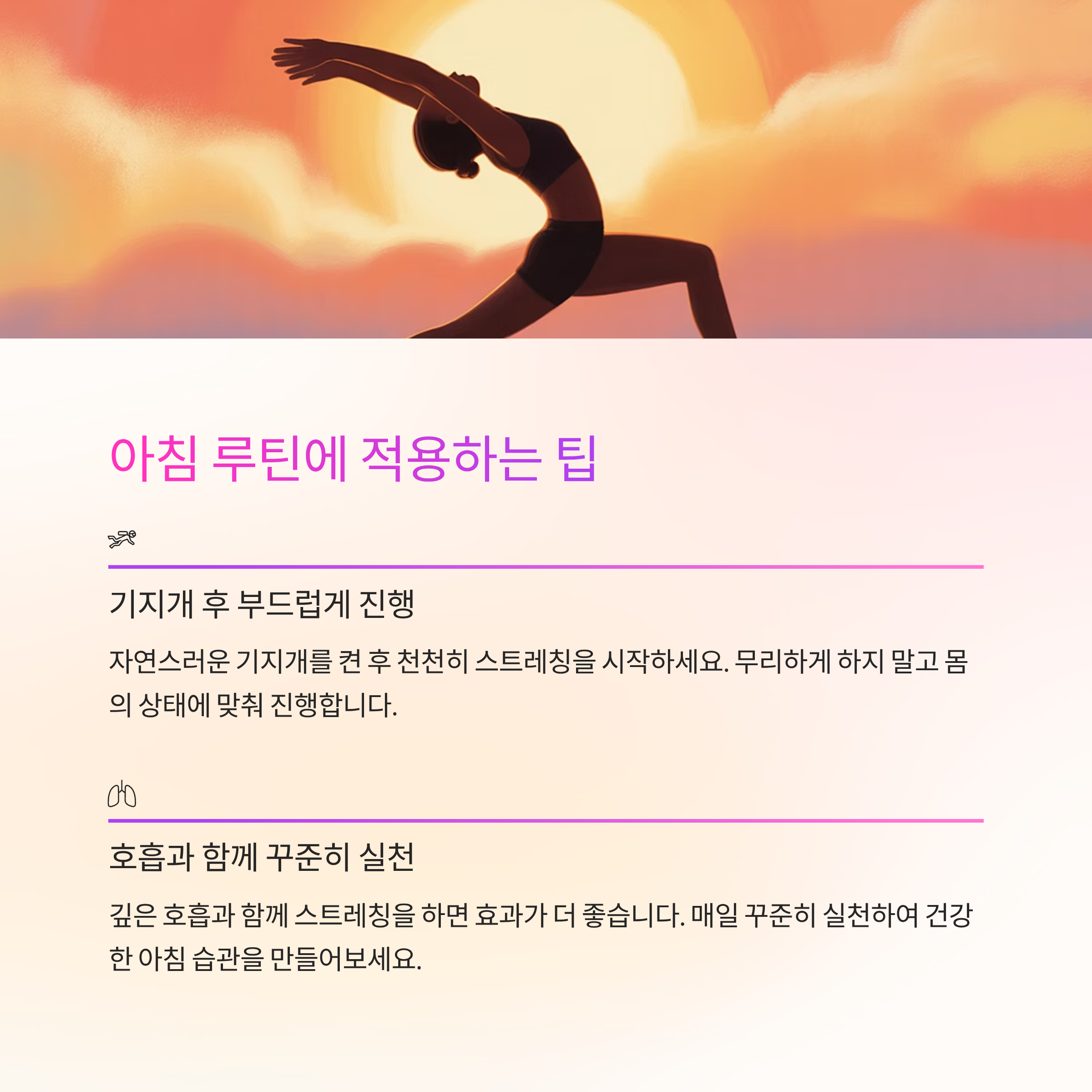 심리적으로도 하루의 시작을 여유롭게 만들며, 스트레스 호르몬(코르티솔) 급증을 완화시킵니다. 매일 5~10분의 짧은 스트레칭만으로도 유연성 향상, 요통 완화, 피로 회복에 큰 도움을 받을 수 있습니다.