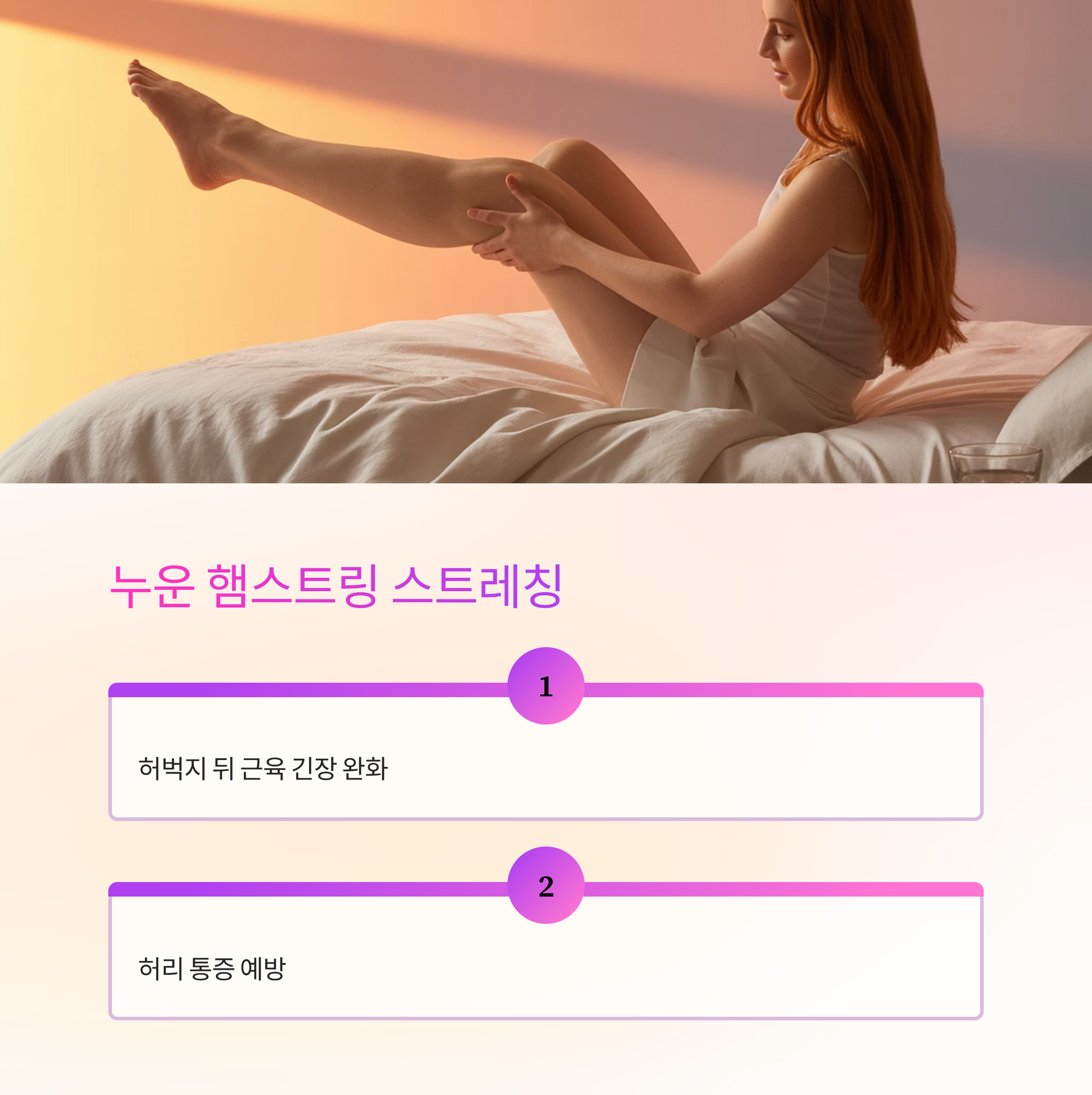 누워서 한쪽 다리를 들어 손으로 종아리나 발목을 잡고 몸 쪽으로 당깁니다. 반대쪽 다리는 침대에 붙여두세요. 허벅지 뒤쪽 근육(햄스트링)의 긴장을 풀어주어 허리 통증 예방에 좋습니다.