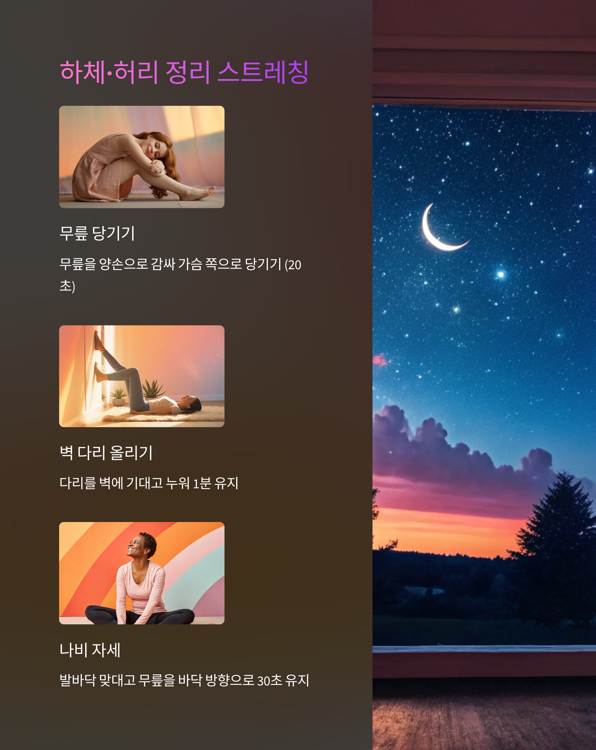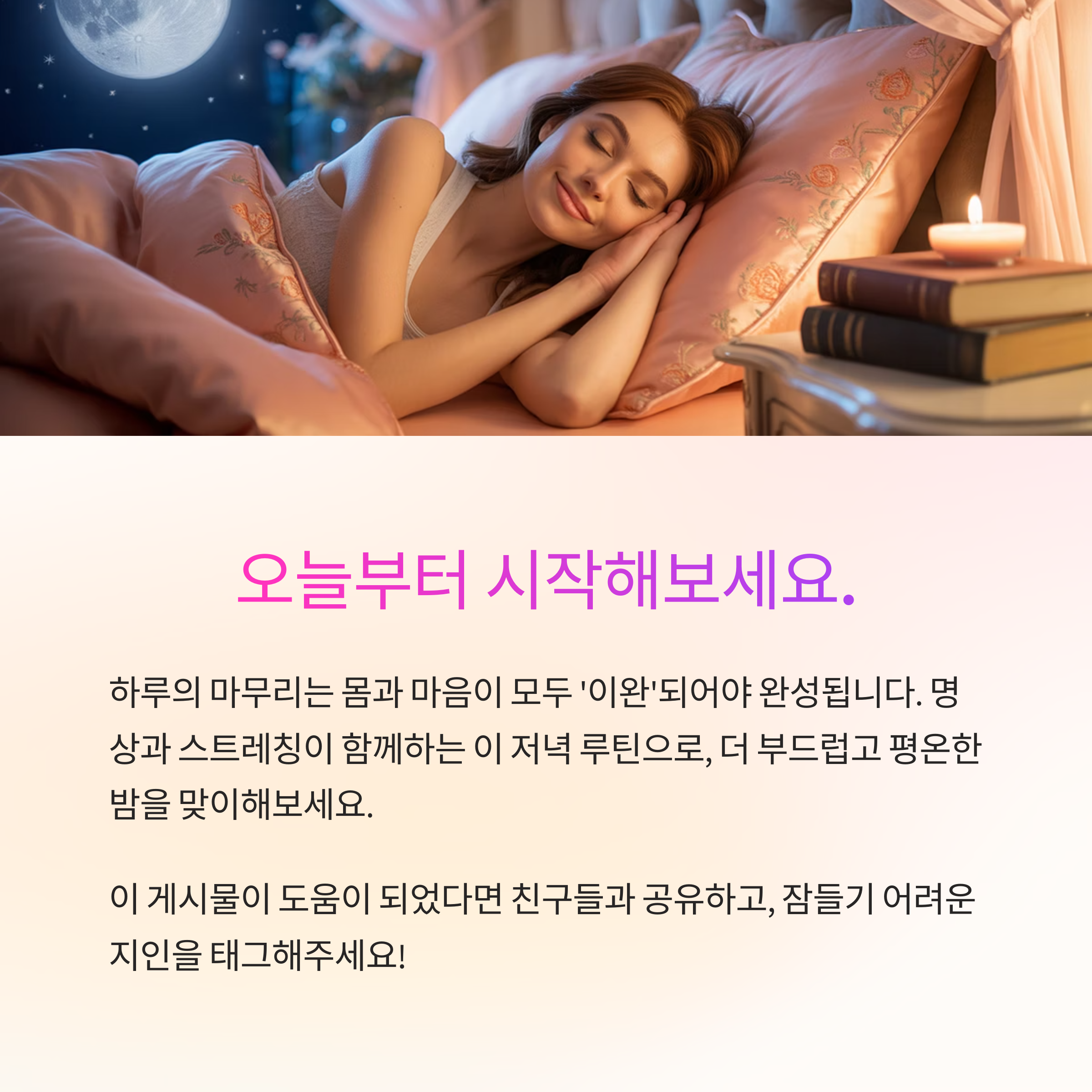 긴장된 하루를 부드럽게 풀어주는 저녁 명상+스트레칭 루틴으로 깊고 편안한 잠을 준비하세요.