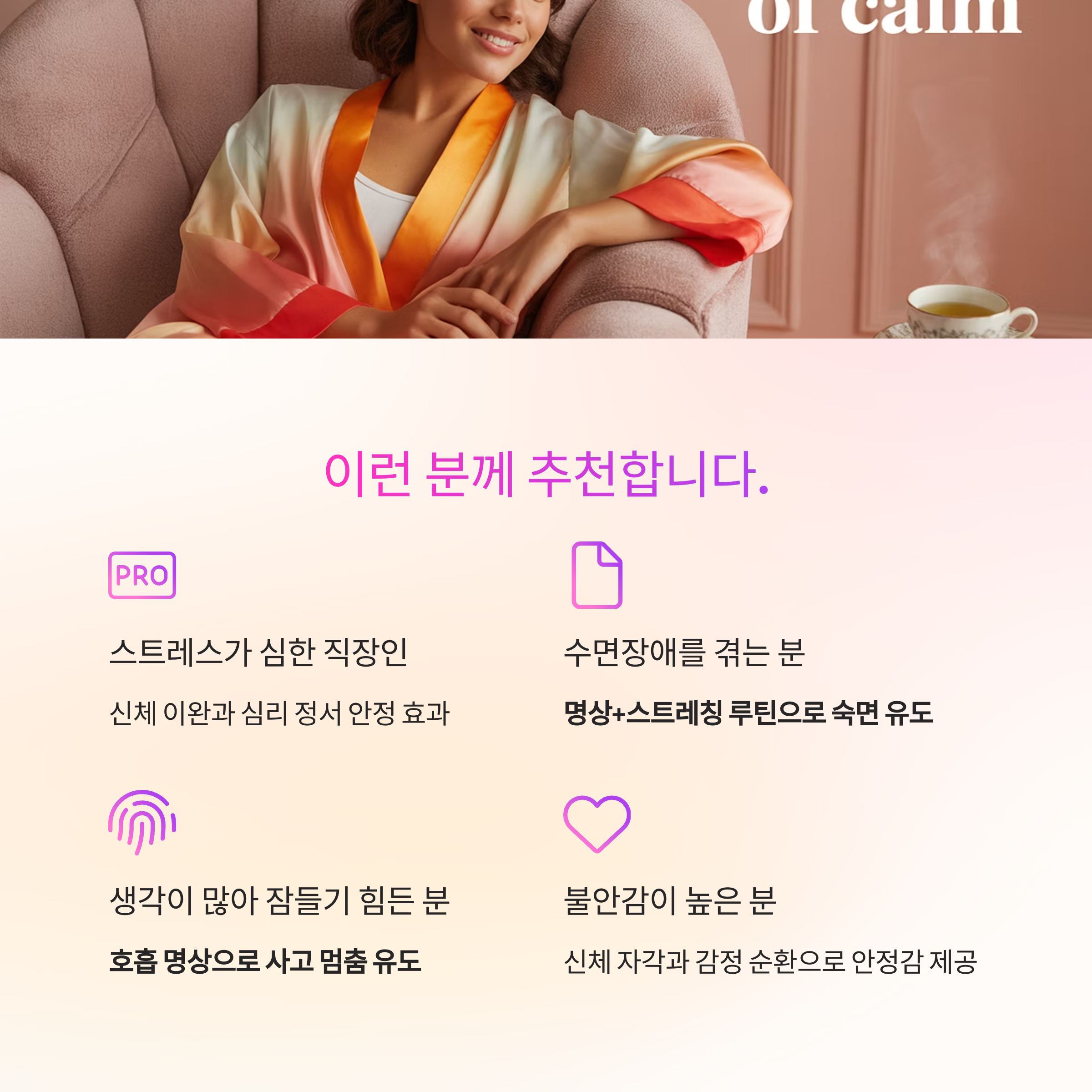| 스트레스가 심한 직장인 | 신체 이완 + 심리 정서 안정 |