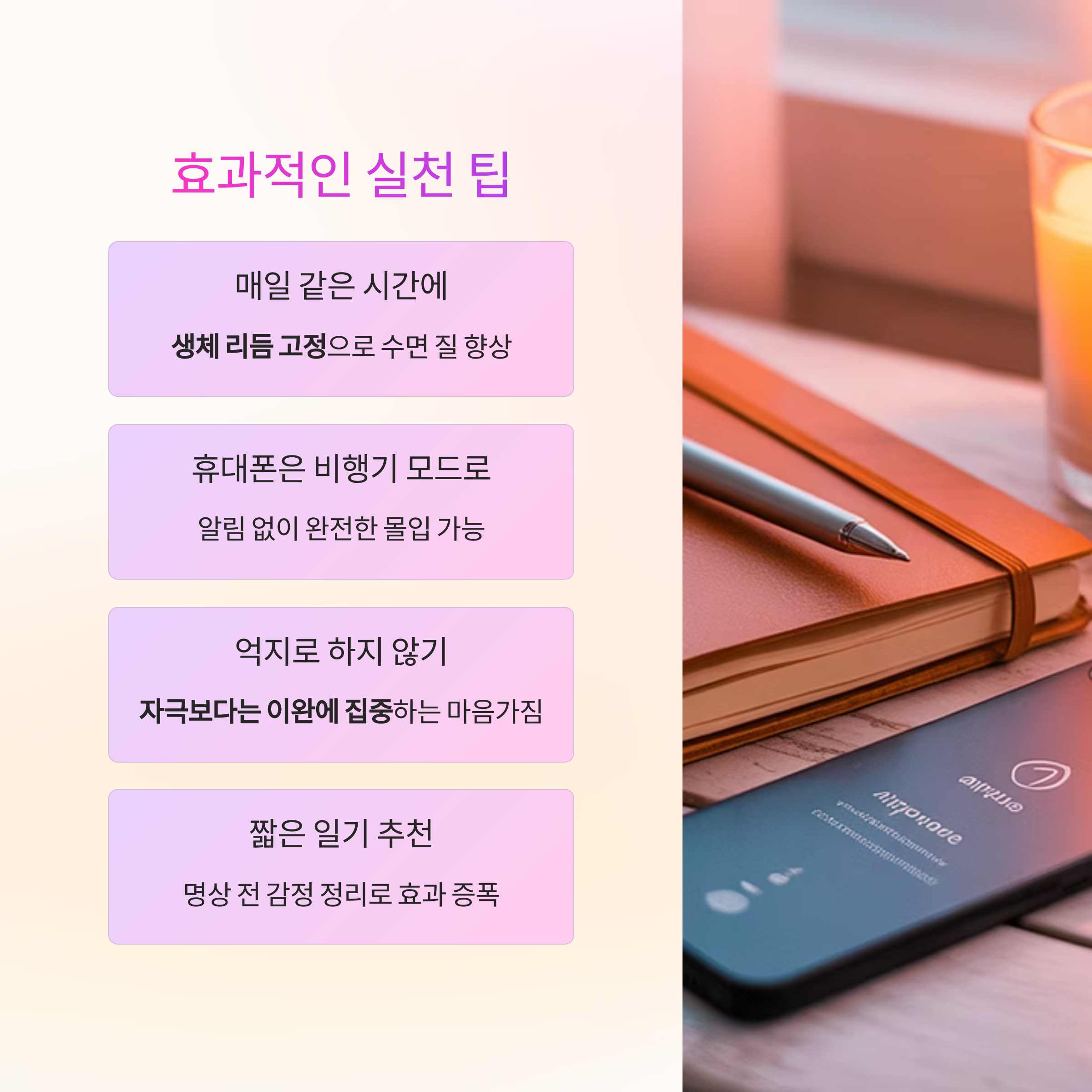| 명상 전 짧은 일기나 감정 정리 추천 | 생각의 정리 효과 증폭 |