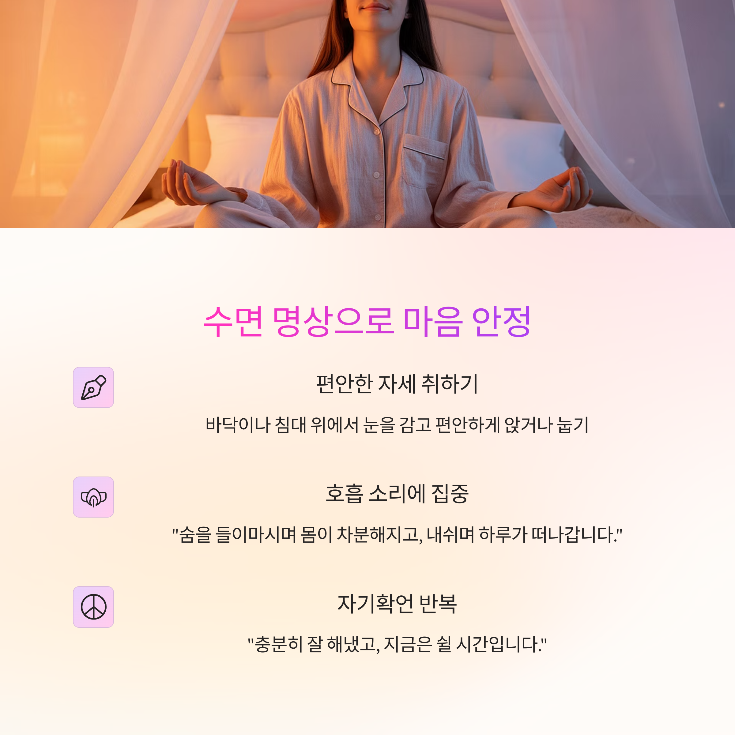 | 생각이 많아 잠들기 힘든 분 | 호흡 명상으로 사고 멈춤 유도 |