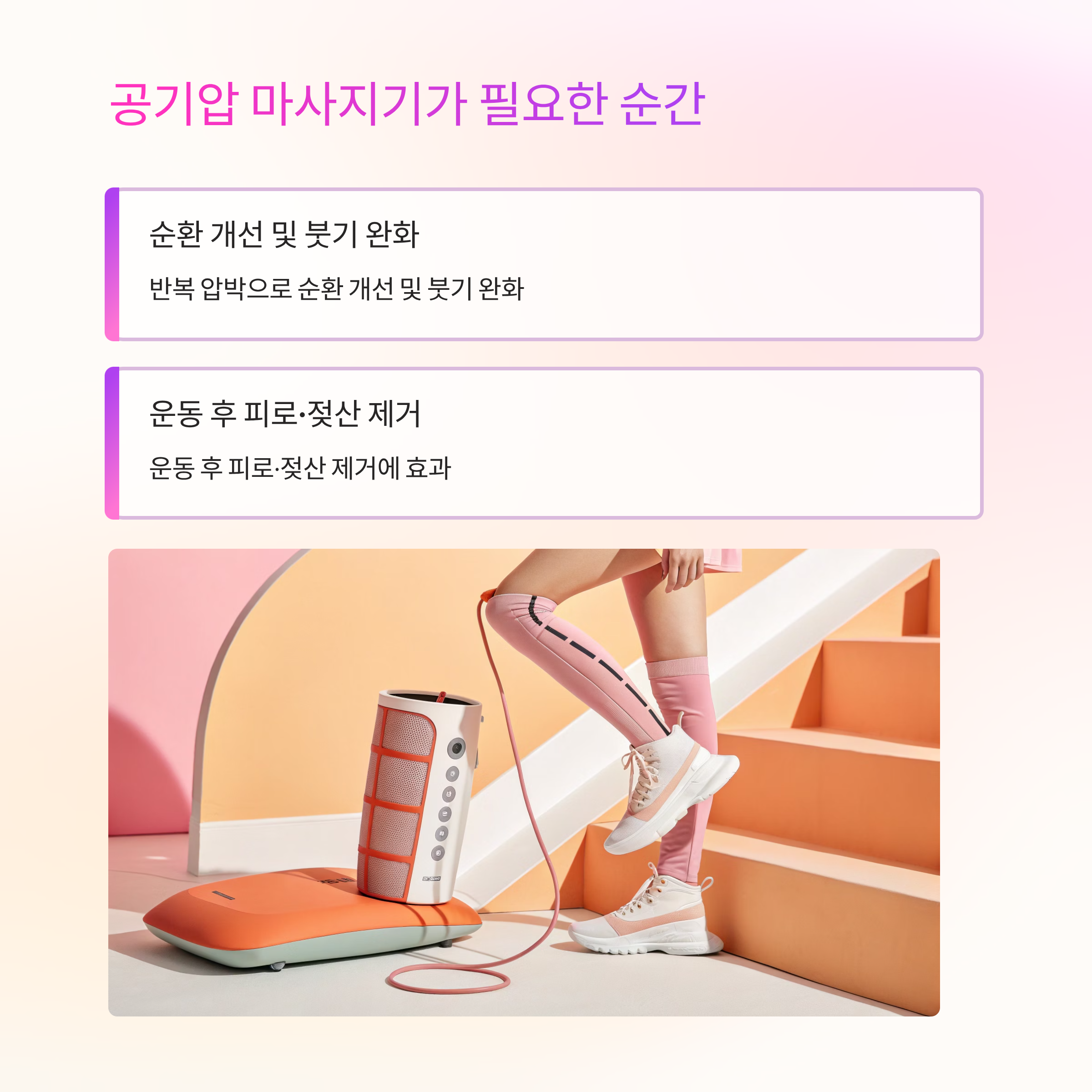 공기압 마사지기는 손으로 하는 마사지와 다른 ‘압박 + 이완’의 리듬 덕분에 종아리 피로·붓기·근육 회복에 매우 효과적이라는 결론입니다.