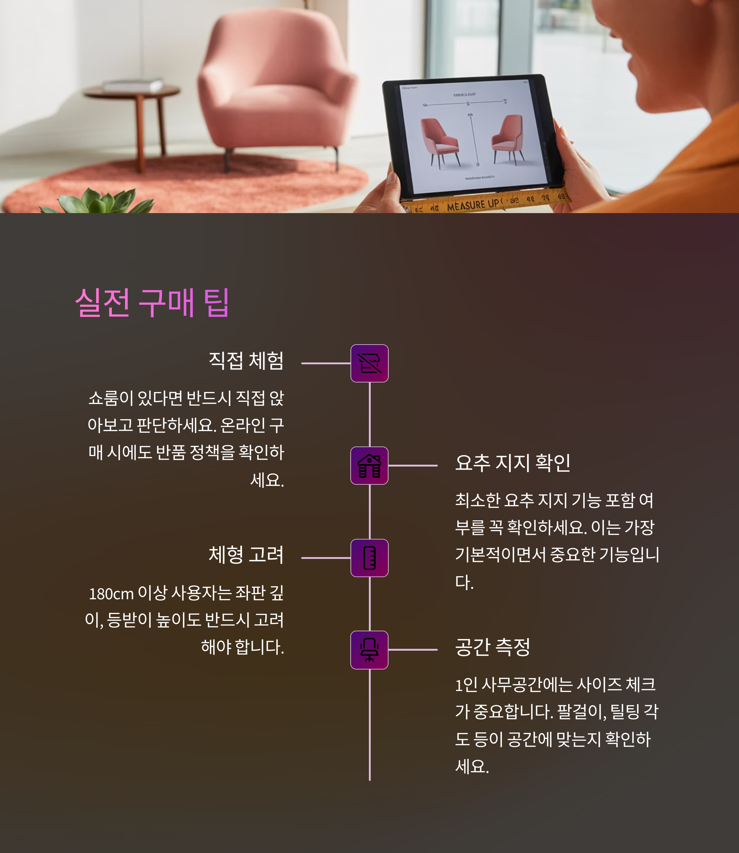 - 1인 사무공간에는 사이즈 체크 중요 (팔걸이, 틸팅 각도 등)