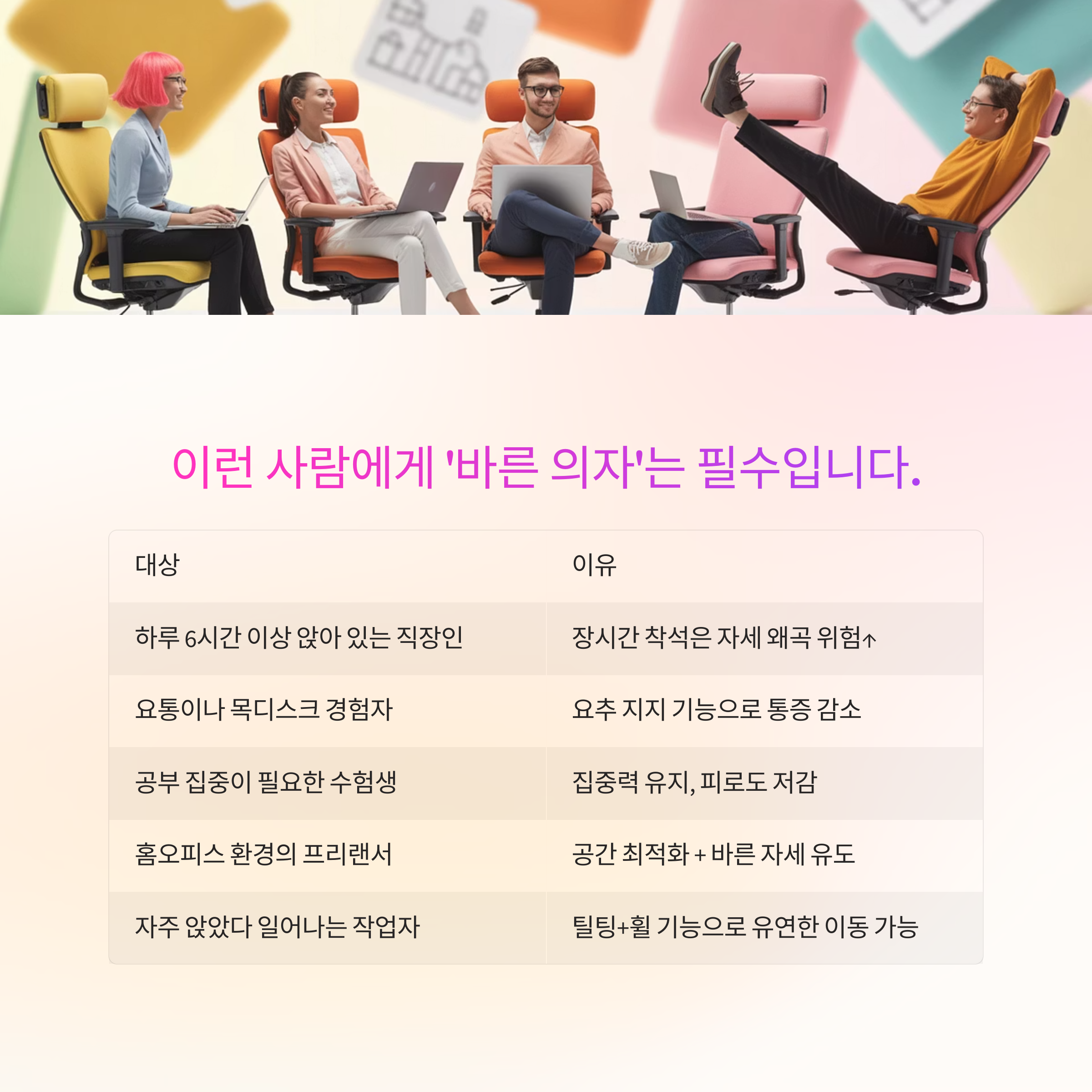 바른 자세는 좋은 의자에서 시작됩니다. 내 몸에 맞는 의자를 선택하는 것, 그것이 당신의 허리와 하루를 지키는 첫걸음입니다.
