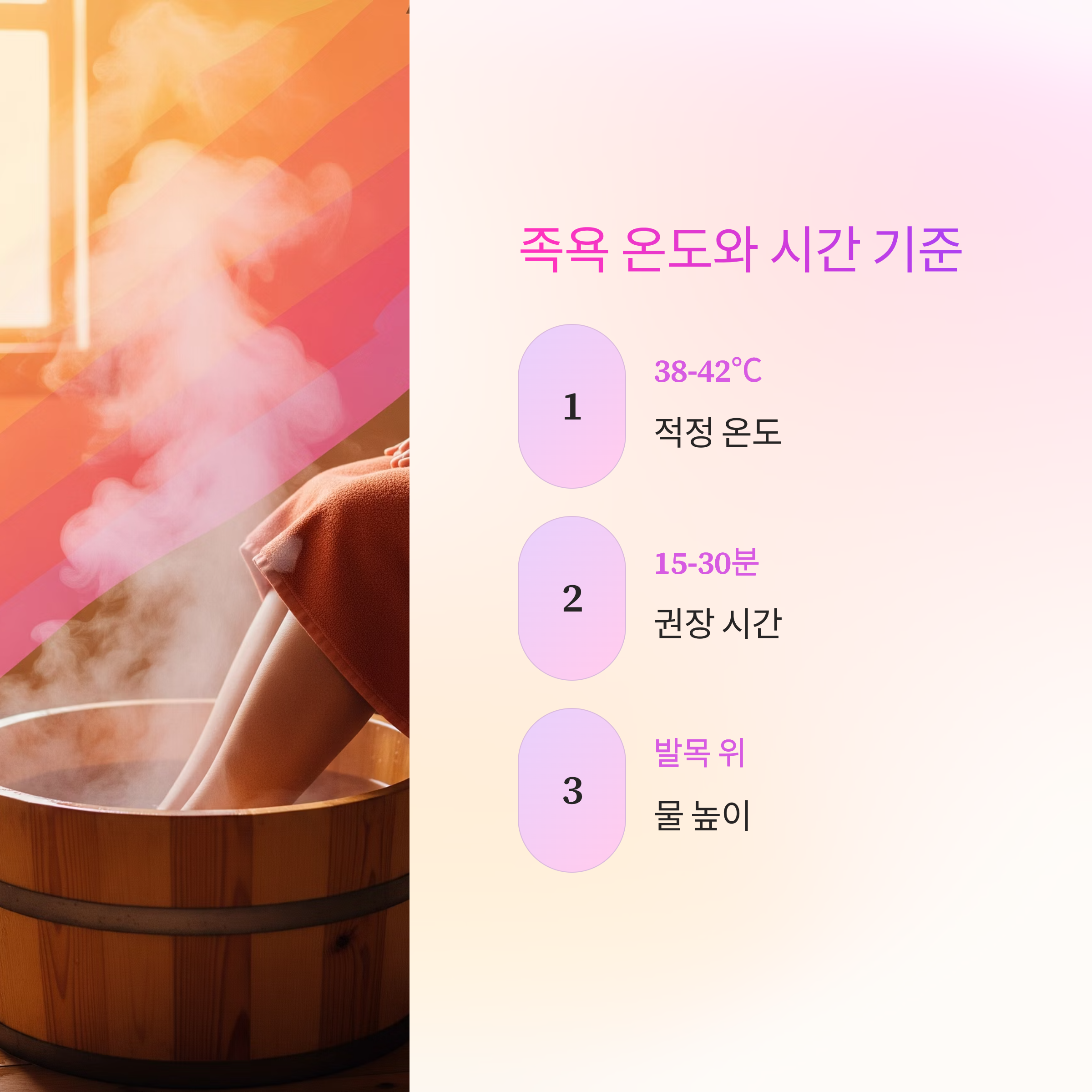 30분 → 38~42℃ → 발목 위까지 → 저녁 시간 이 4가지가 족욕 성공 공식입니다.