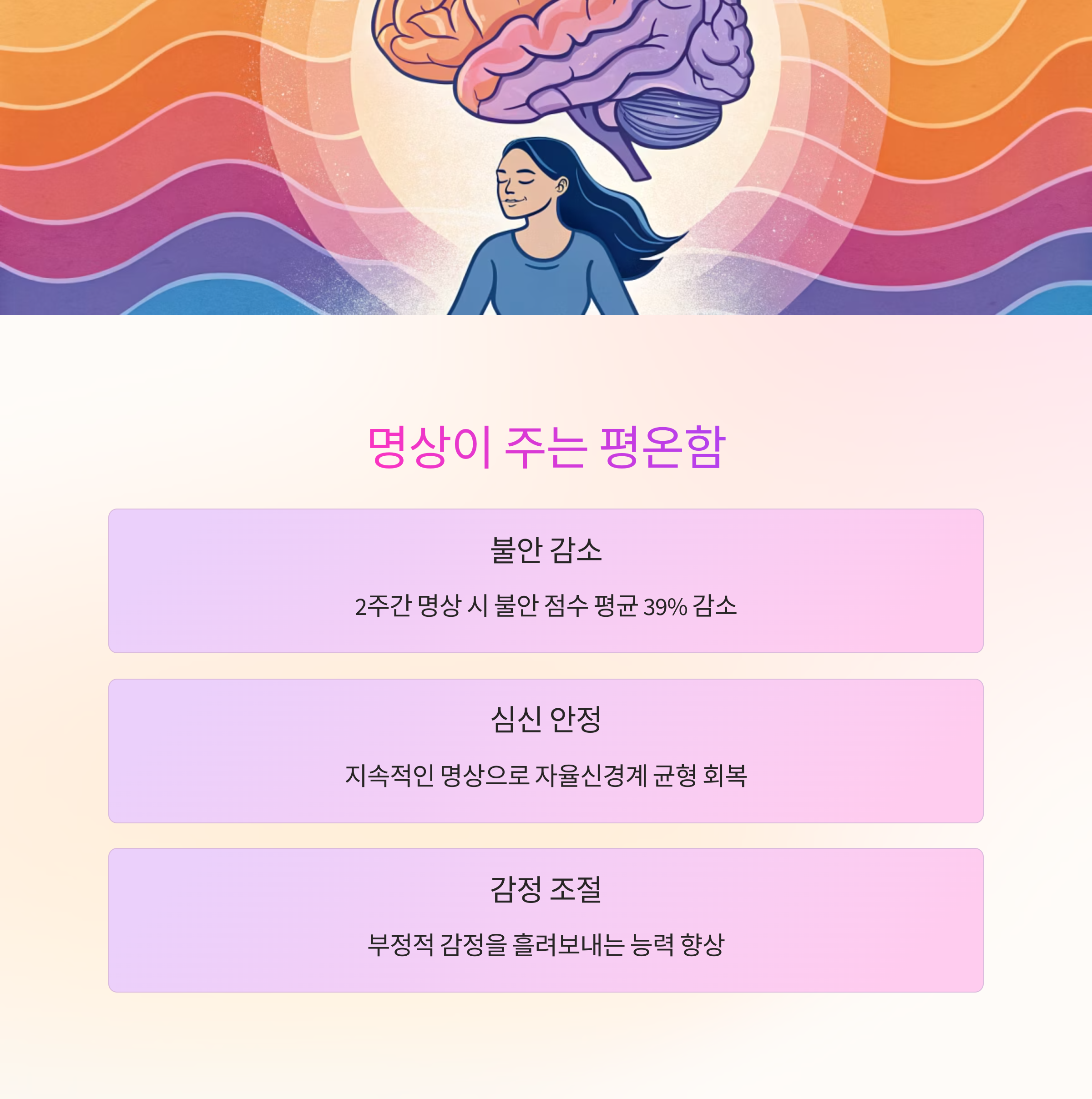 명상은 뇌파를 안정시키고 불안감을 줄여주는 과학적 효과가 입증되어 있어요.