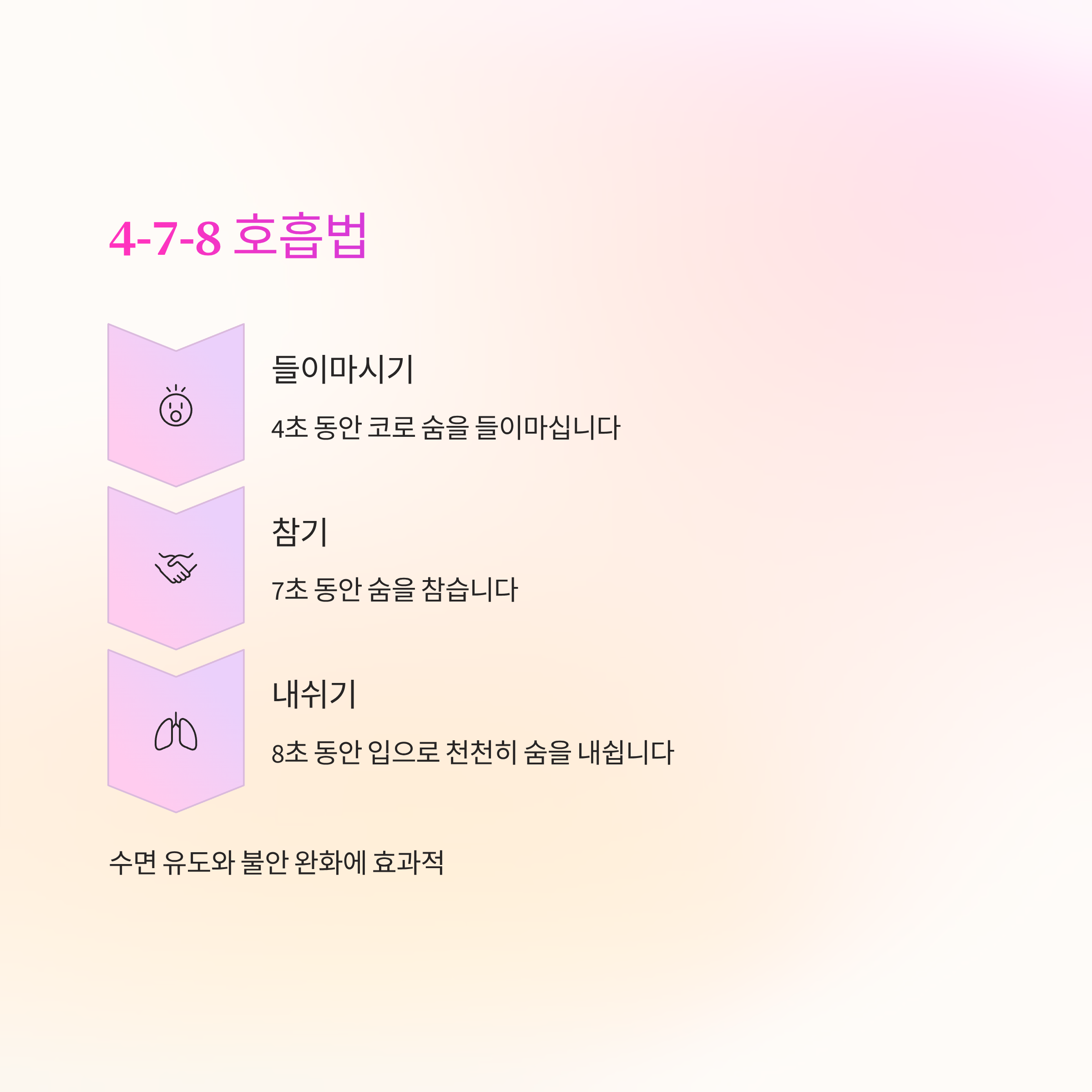 4-7-8 호흡법은 미국의 내과 의사 앤드류 와일 박사가 제안한 방법으로, ‘수면 호흡법’으로도 유명합니다. 방법: 코로 4초간 들이마시고, 7초간 숨을 참은 뒤, 8초간 입으로 천천히 내쉽니다. 이 과정을 4회 반복하면 마음이 가라앉고 불안감이 완화됩니다. 특히 잠들기 전 실시하면 숙면을 유도하는 데 큰 도움이 됩니다.