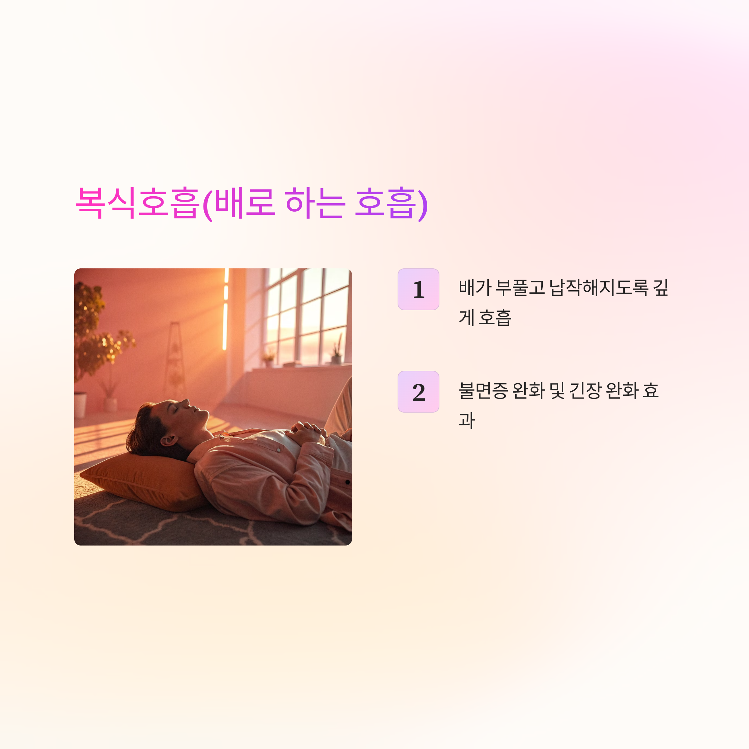 9. 오늘의 요약하루 종일 쌓이는 스트레스는 몸과 마음을 지치게 만들고, 집중력 저하와 불면증까지 이어질 수 있습니다. 호흡 운동은 짧은 시간 투자로 스트레스를 완화하고 자율신경을 안정시켜, 몸과 마음을 회복시키는 가장 손쉬운 방법 중 하나입니다. 특히 하루 5분만 꾸준히 실천해도 긴장 완화, 두통 완화, 수면 개선 효과를 얻을 수 있습니다. 지금부터 실생활에서 따라 할 수 있는 대표 호흡 운동법을 소개합니다.