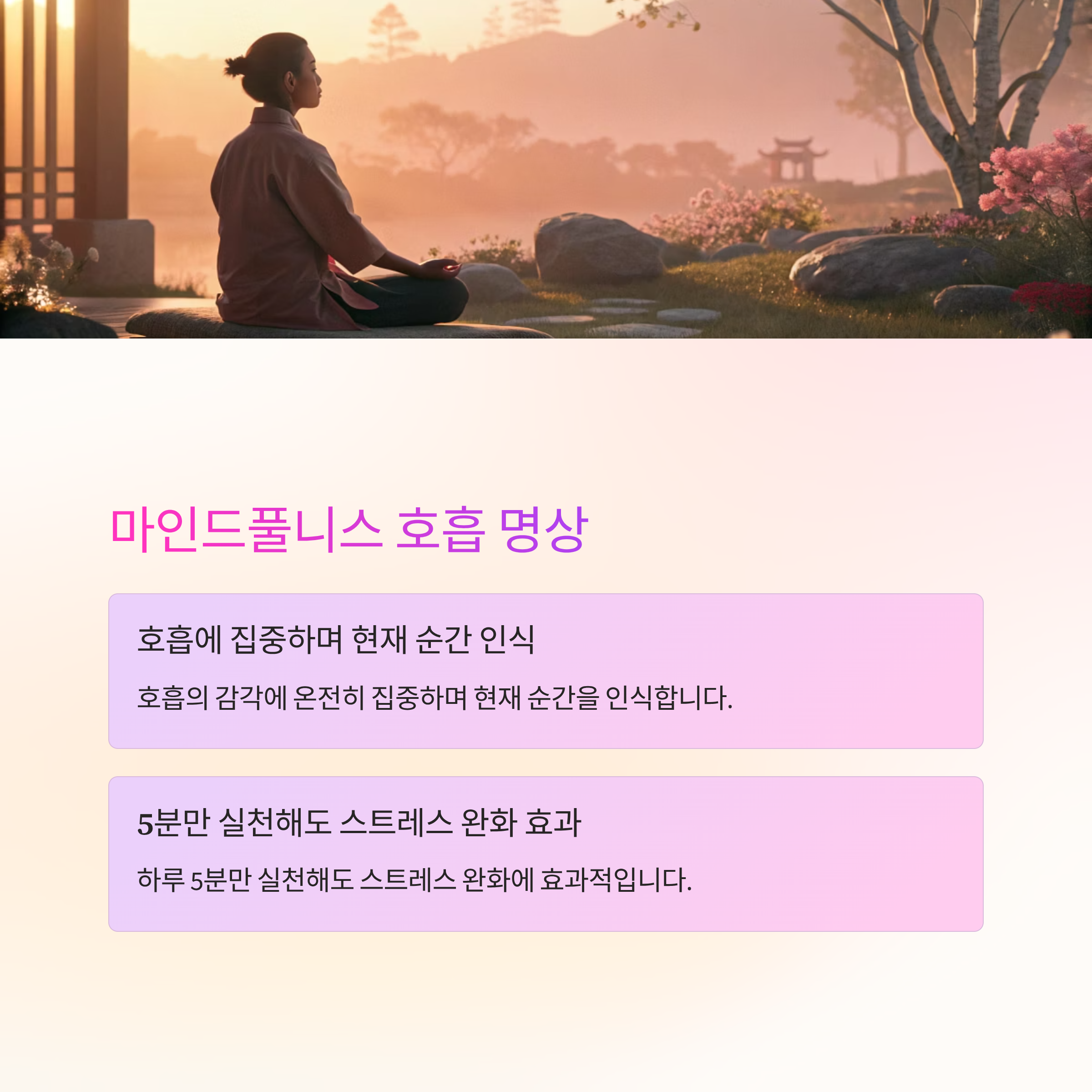 마인드풀니스 호흡은 호흡 그 자체에 집중하면서 ‘현재 순간’을 인식하는 훈련입니다. 방법: 조용한 공간에 앉아 눈을 감고, 코로 숨이 들어오고 나가는 감각에만 집중합니다. 잡생각이 떠올라도 억누르지 말고 다시 호흡으로 주의를 돌립니다. 5분만 해도 마음이 차분해지고 스트레스가 완화되는 효과를 얻을 수 있습니다.