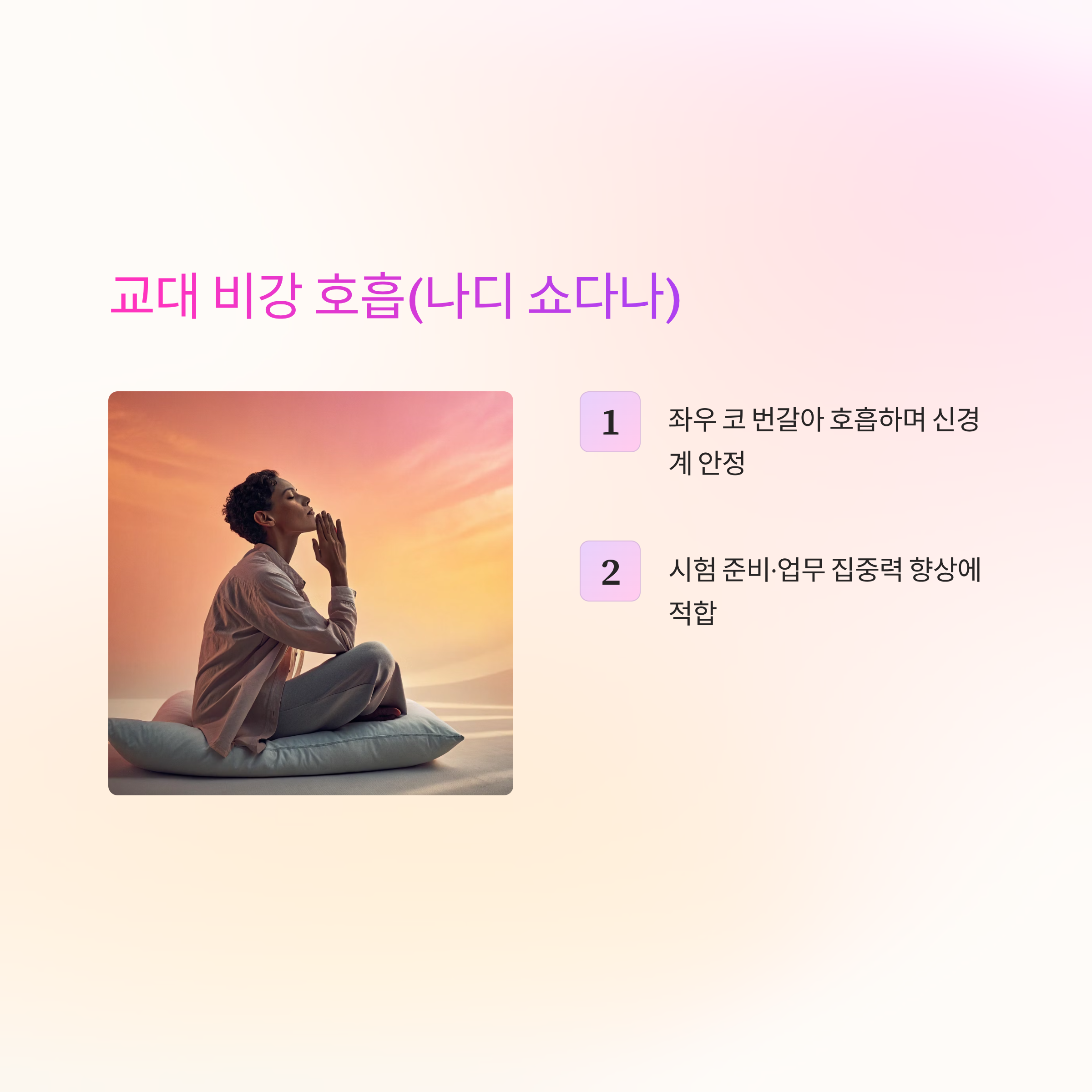 요가에서 자주 활용되는 호흡법으로, 좌우 뇌의 균형을 맞추고 집중력을 강화합니다. 방법: 오른손 엄지로 오른쪽 콧구멍을 막고 왼쪽으로 숨을 들이마신 후, 약지로 왼쪽을 막고 오른쪽으로 내쉽니다. 이 과정을 반복하면서 양쪽 코를 번갈아 사용하면 신경계 안정과 집중력 향상에 큰 효과가 있습니다. 특히 시험 준비나 업무 전 마음을 정리할 때 적합합니다.