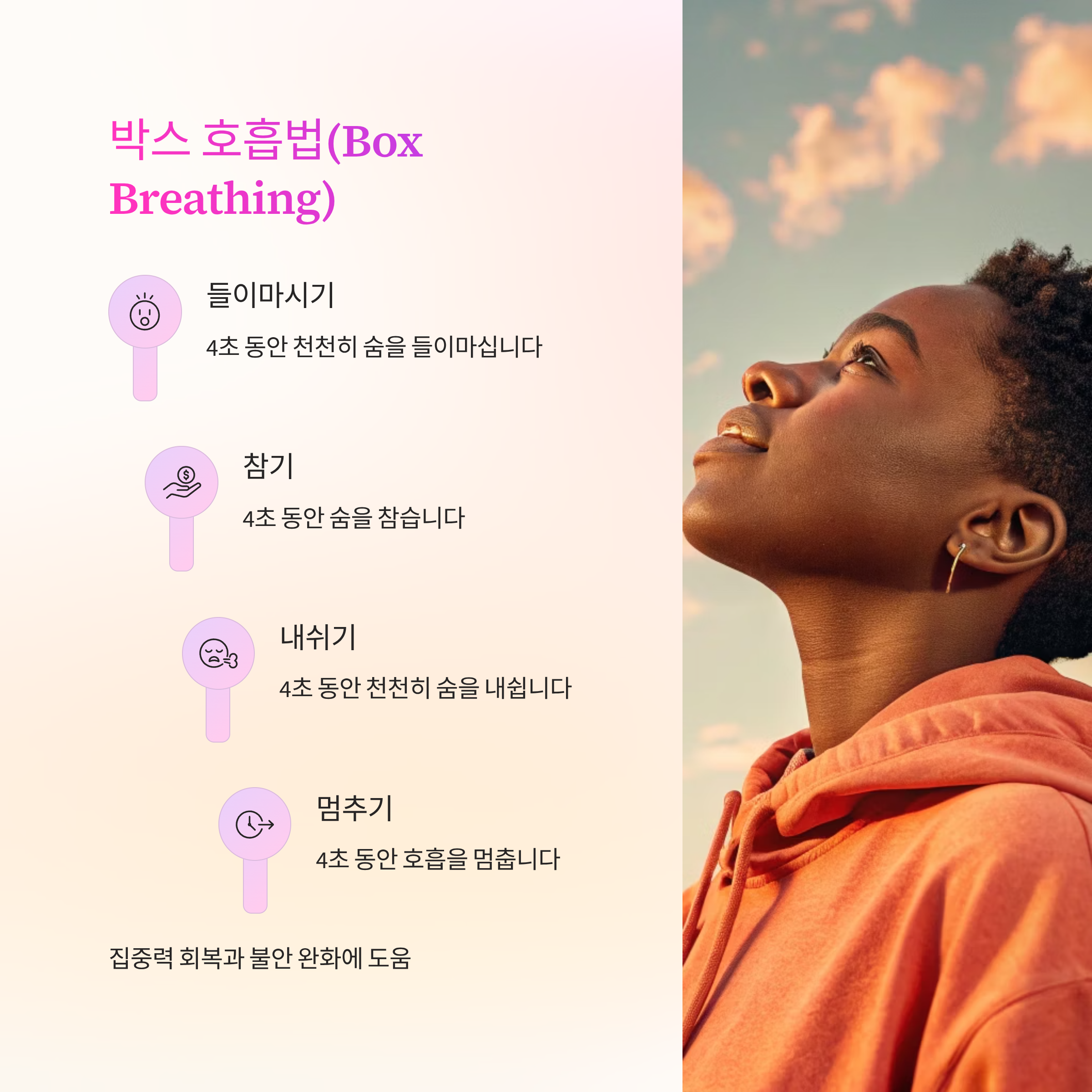 박스 호흡법은 특수부대 훈련에도 쓰일 만큼 집중력 회복과 스트레스 제어에 효과적인 방법입니다. 방법: 4초 동안 숨을 들이마시고, 4초간 숨을 멈췄다가, 4초간 내쉰 후 다시 4초간 멈춥니다. ‘4-4-4-4’ 패턴을 박스 모양이라 하여 박스 호흡법이라 부릅니다. 이 방법은 불안한 상황에서도 호흡을 안정시키고, 차분한 마음을 회복하는 데 도움이 됩니다.