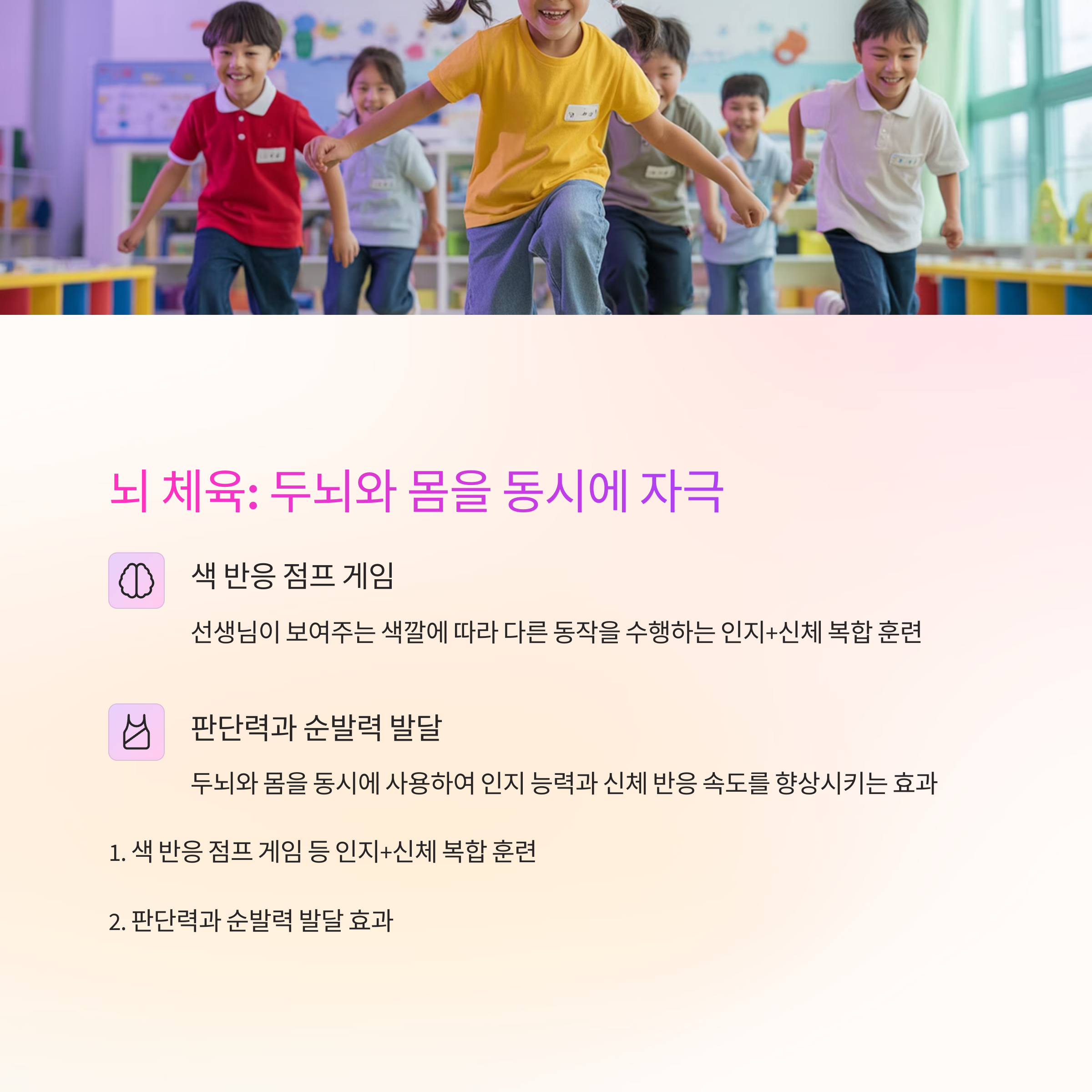 → 규칙을 기억하고 반응하는 과정을 통해 운동과 인지 능력이 함께 발달합니다.