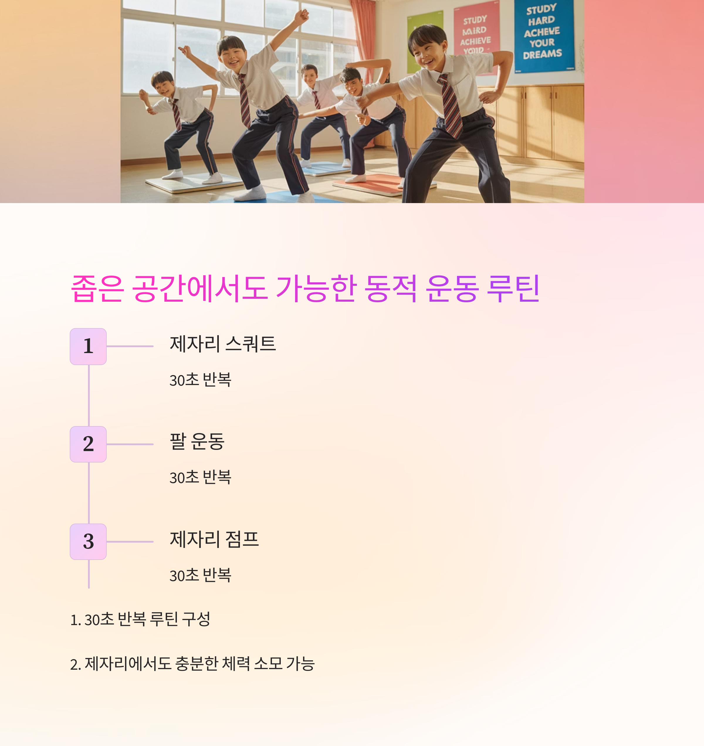 공간과 소음을 고려해야 할 때 유용한 운동입니다. 주로 코어와 스트레칭 중심으로 구성되며, 수업 집중력 향상에도 효과적입니다.