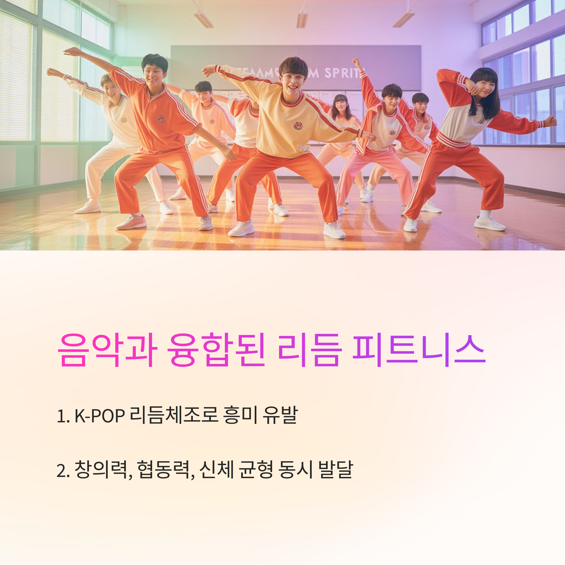 아이들이 좋아하는 K-POP 음악을 활용하면 수업 몰입도와 참여도가 크게 올라갑니다. 동작을 직접 구성해 보는 활동은 창의력 향상에도 탁월합니다.