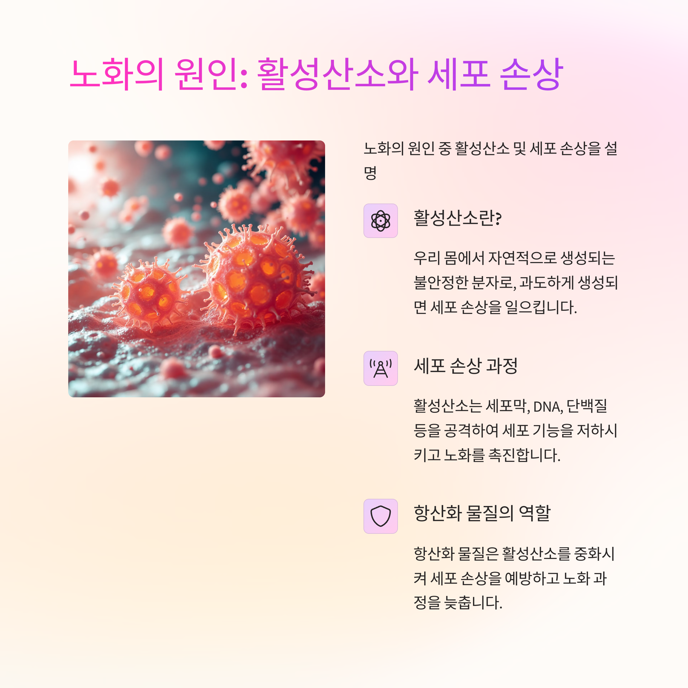 노화의 주요 원인 중 하나는 활성산소입니다. 세포 대사와 스트레스, 자외선 등으로 발생하는 활성산소는 DNA, 단백질, 세포막을 손상해 노화를 촉진합니다. 이를 막기 위한 열쇠는 항산화—항산화 물질은 활성산소를 중화해 세포 손상을 방지하고, 면역력과 피부 탄력, 뇌 기능을 지켜줍니다.