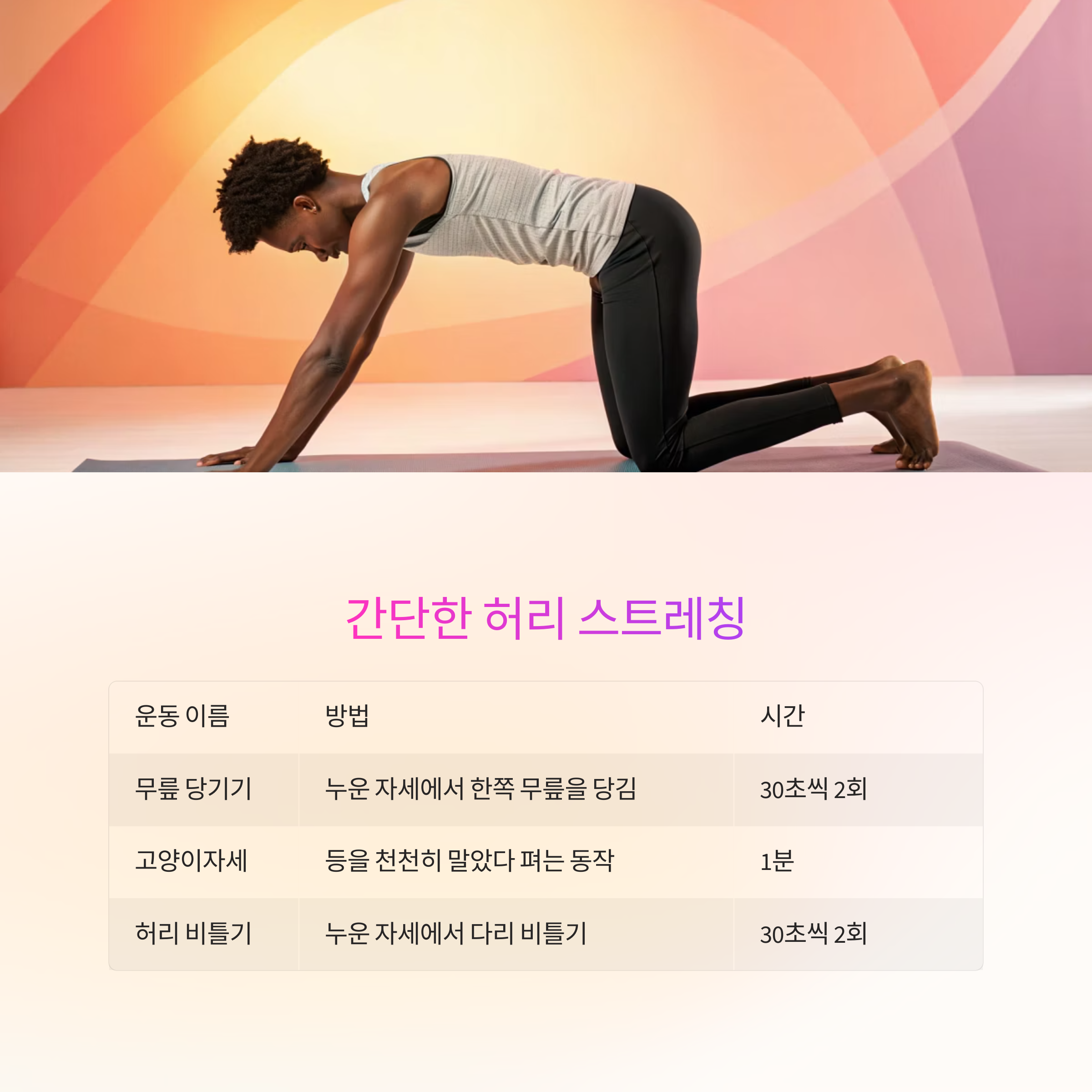 | 무릎 당기기 | 누운 자세에서 한쪽 무릎을 당김 | 30초씩 2회 | 요추 근육 이완 |