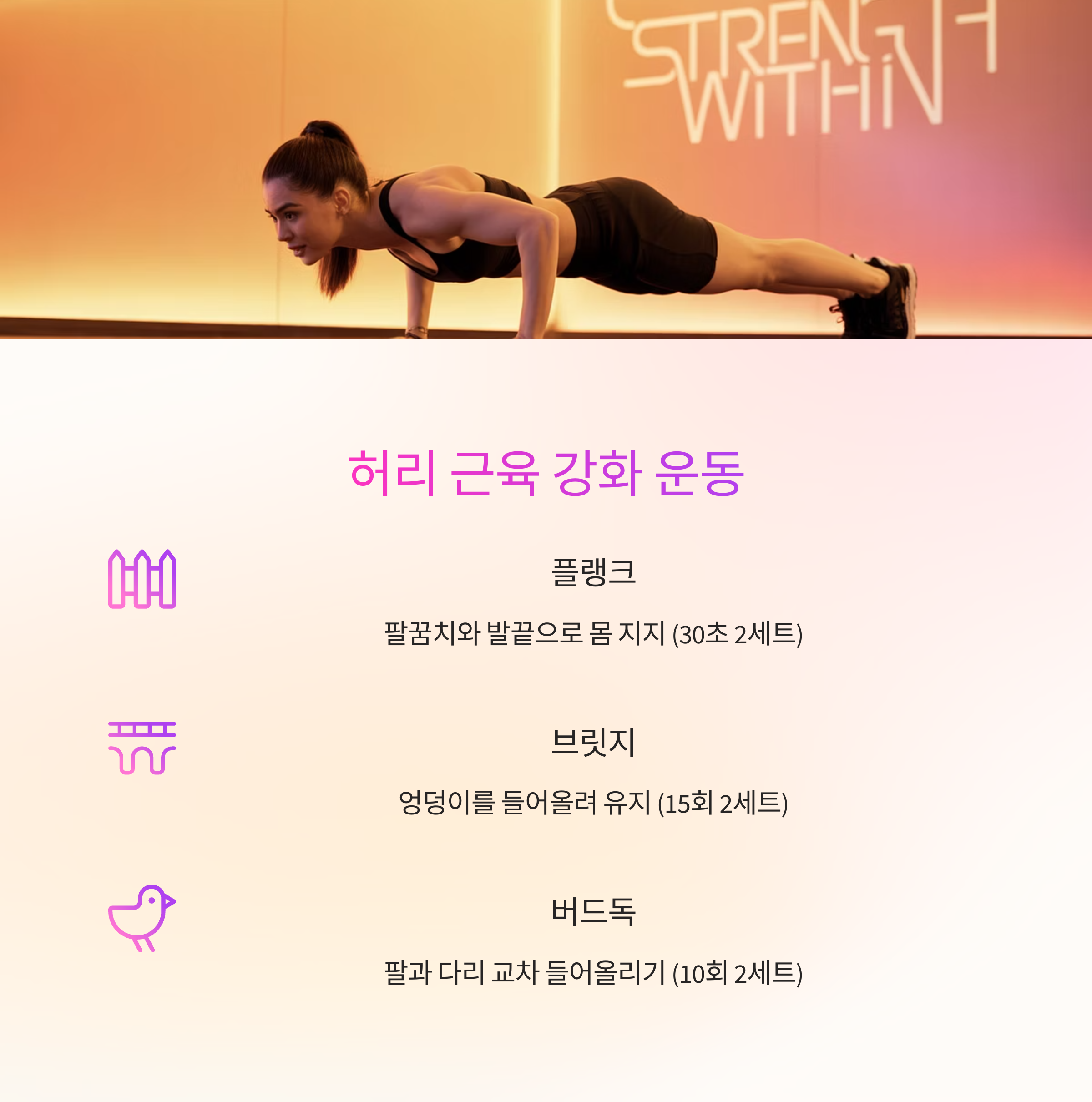 플랭크, 브릿지, 버드독 자세는 허리 주변 근육을 강화해 요통 재발을 예방해 줍니다.