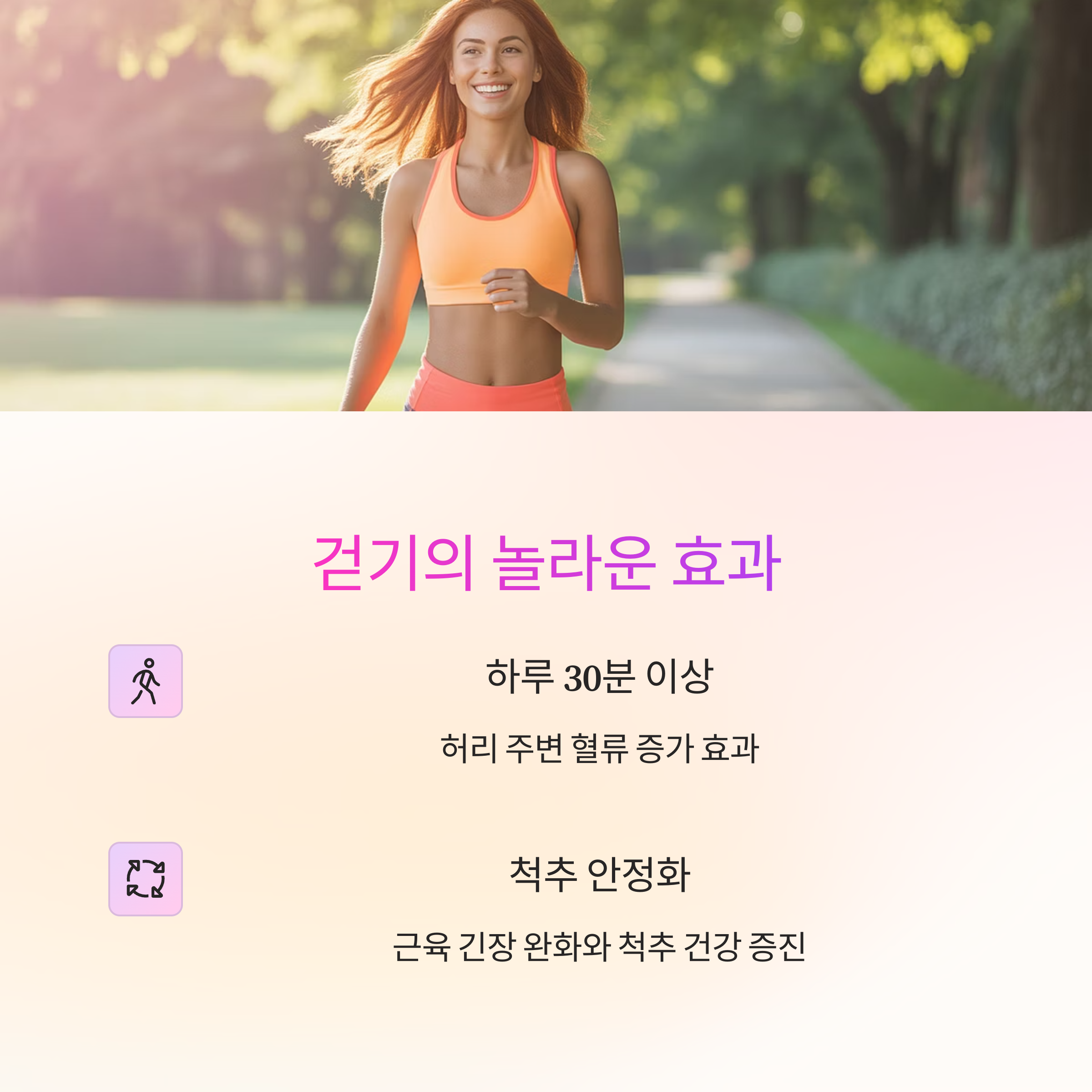 올바른 자세로 하루 30분 이상 걷는 것만으로도 허리 주변의 혈류가 증가하고, 근육의 긴장이 풀리며,