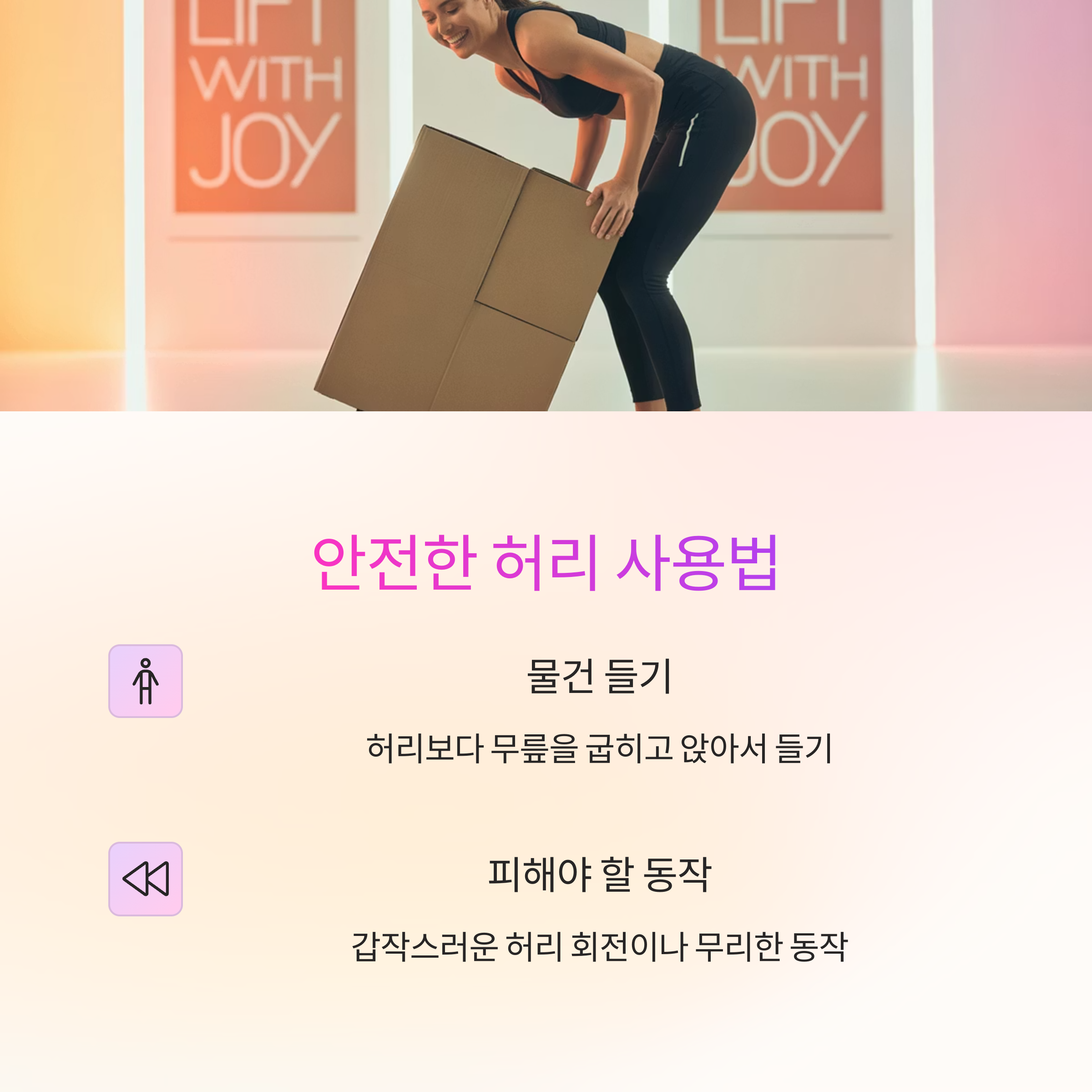 허리를 굽히기보다는 무릎을 굽히고 앉아 물건을 들어야 하며, 갑작스러운 허리 회전이나 무리한 동작은 피하는 것이 안전합니다.