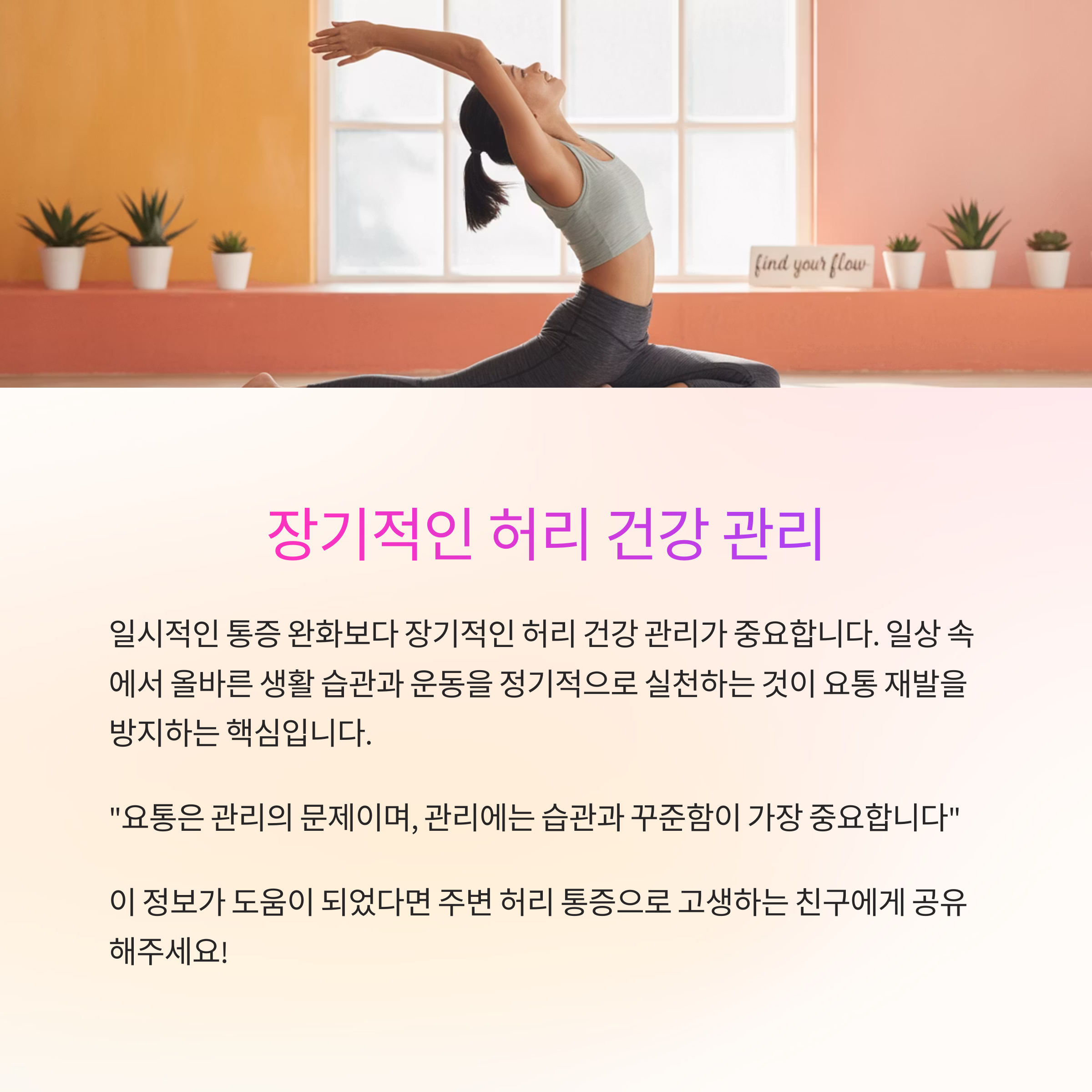 "일상에서 반복되는 작은 습관들이 요통을 예방하는 가장 강력한 방패입니다."