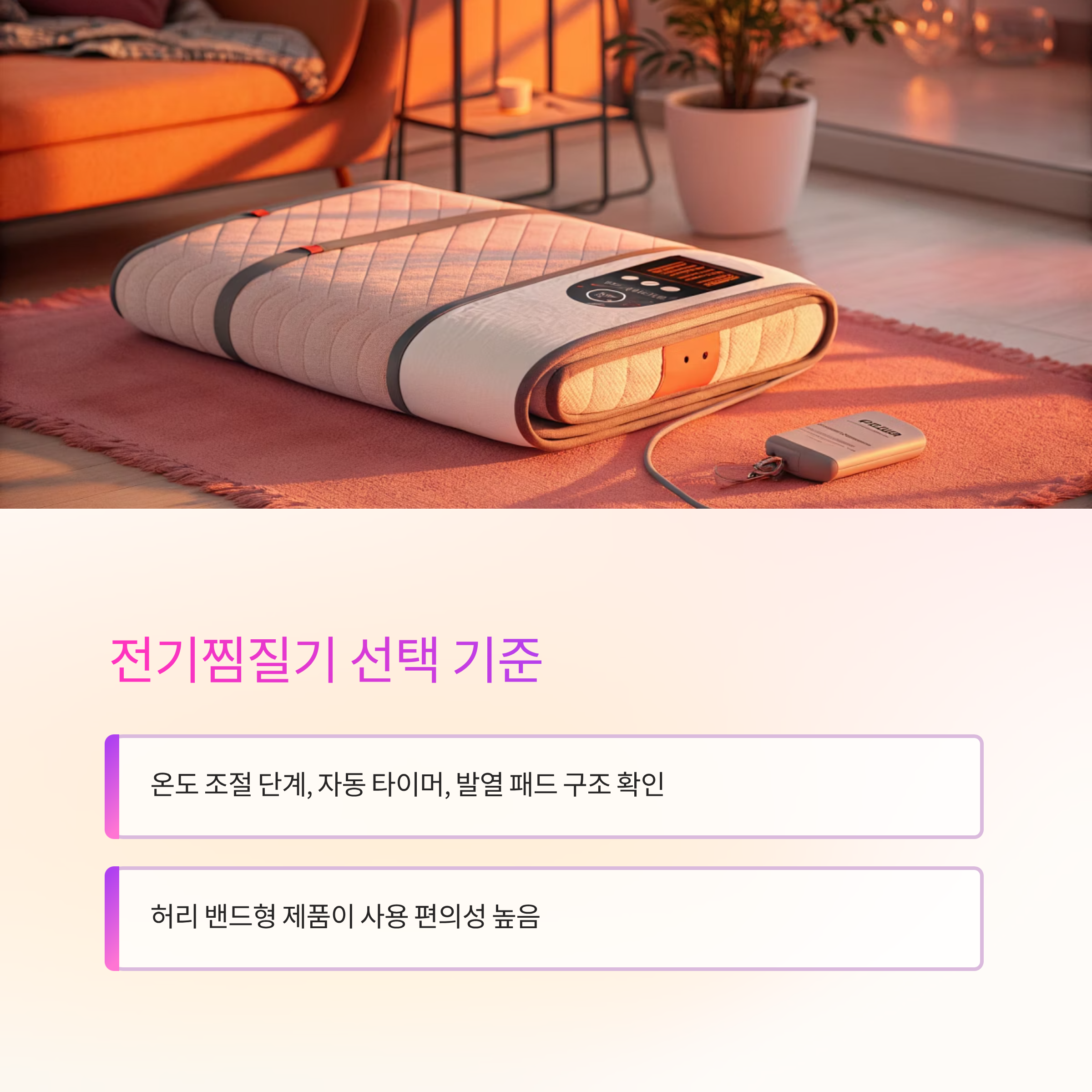 전기찜질기는 단순히 따뜻하게 만드는 장치가 아니라 내 허리 상태에 맞는 기능을 선택해야 효과가 극대화됩니다.