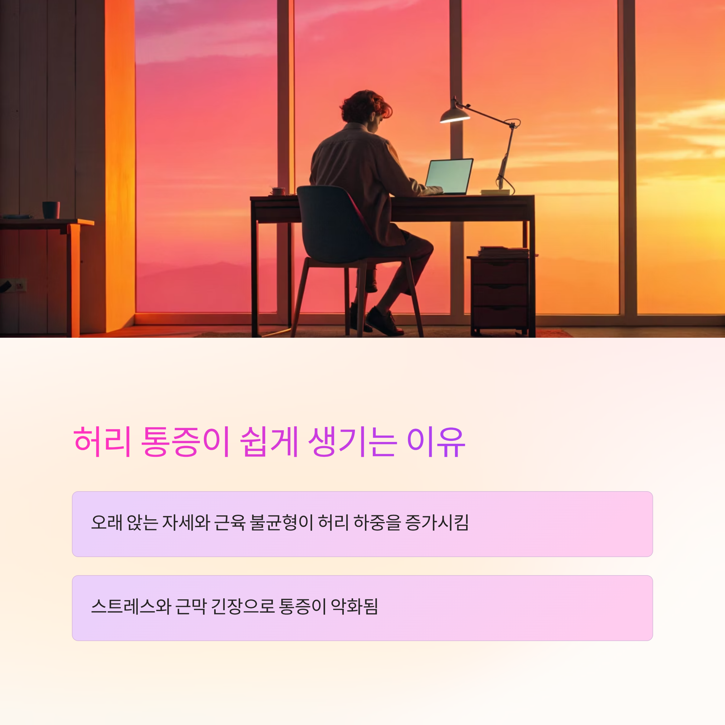 허리 통증은 단순히 ‘근육이 뭉쳐서’ 오는 것이 아닙니다. 구조적, 생활습관적 요인이 복합적으로 작용합니다.