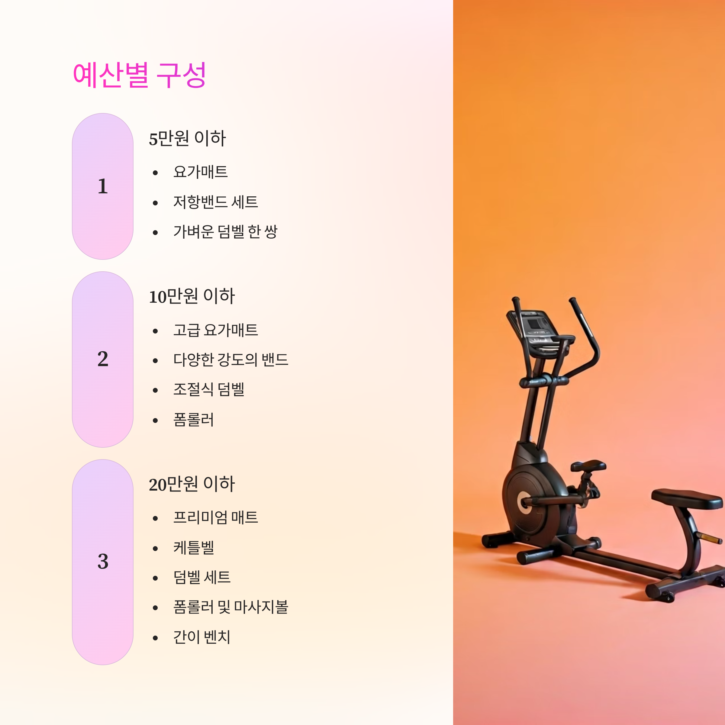 - 10만원대: + 덤벨 or 케틀벨, 스트레칭 도구 추가