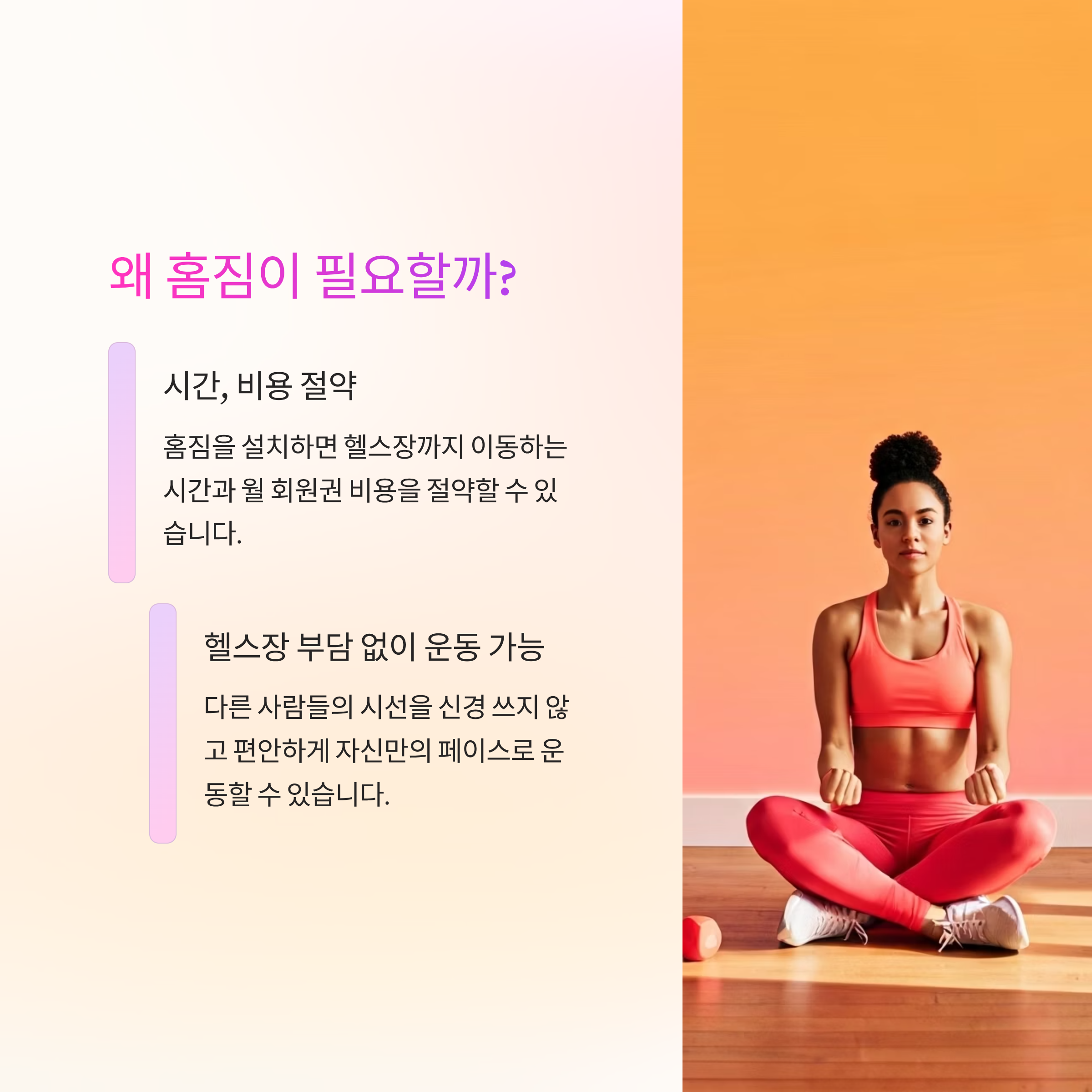헬스장을 가기엔 귀찮고, PT는 부담스럽고, 날씨는 계속 안 좋고… 이럴 때 홈짐은 시간과 비용을 모두 절약할 수 있는 최고의 대안입니다.